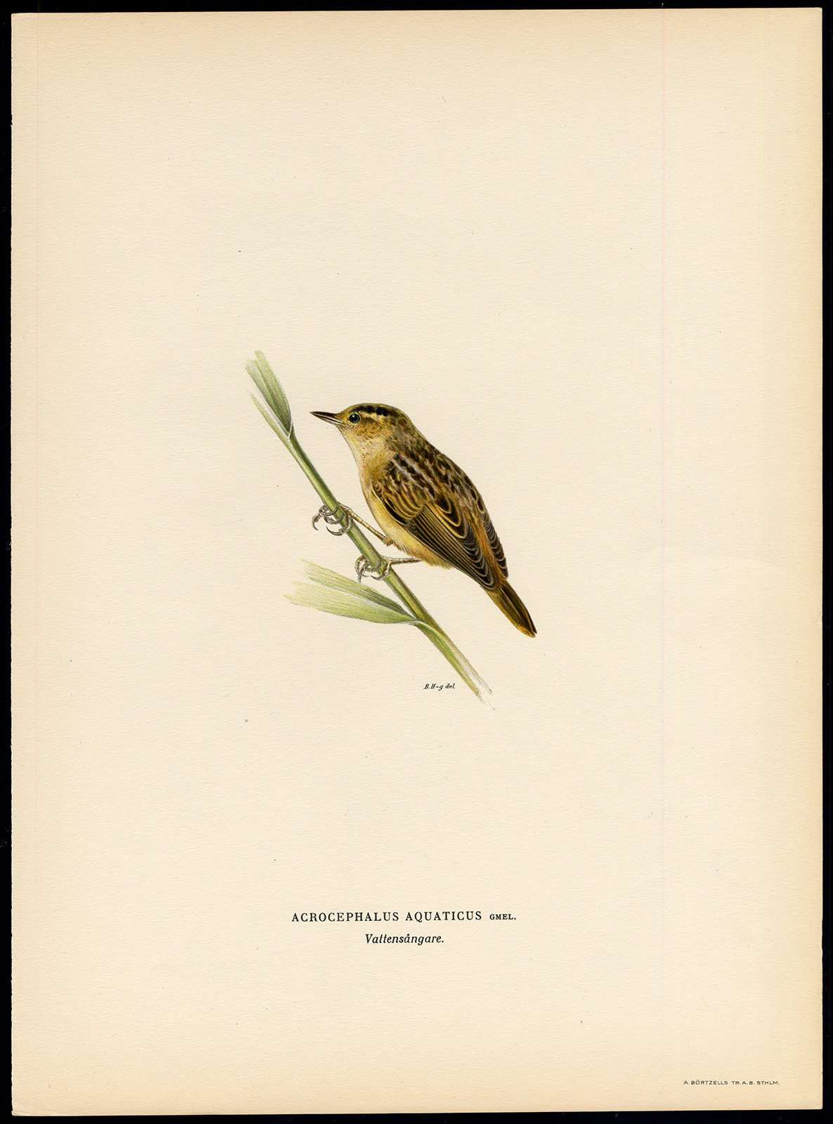 Onderwerp: Bord : ‘Acrocephalus aquaticus Gmel.’ (Acrocephalus paludicola – Waterzanger).