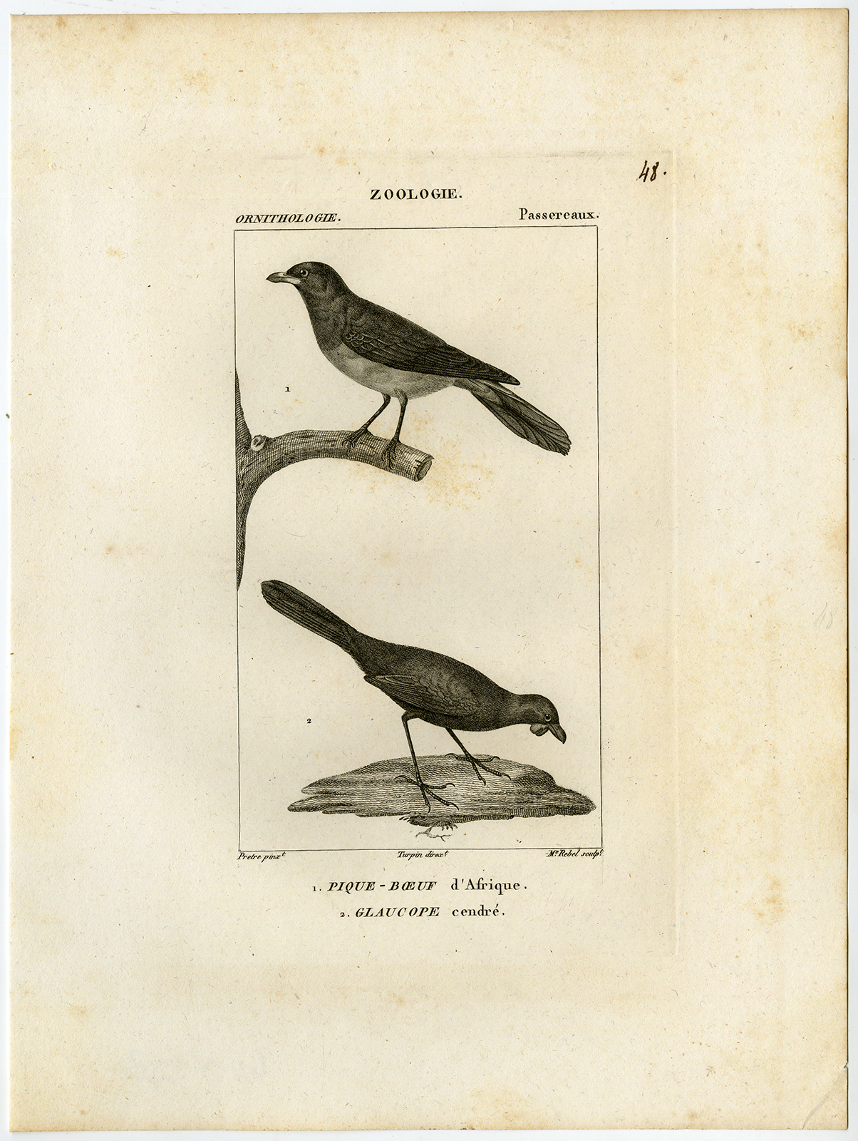 Onderwerp: Antieke prent, getiteld: ‘Pl. 48. Zoölogie, Ornithologie, Passereaux. 1. Pique-boeuf d’afrique – 2. Glaucope cendre.’ – Dit bord toont vogelsoorten; ossenpik en de kokako.