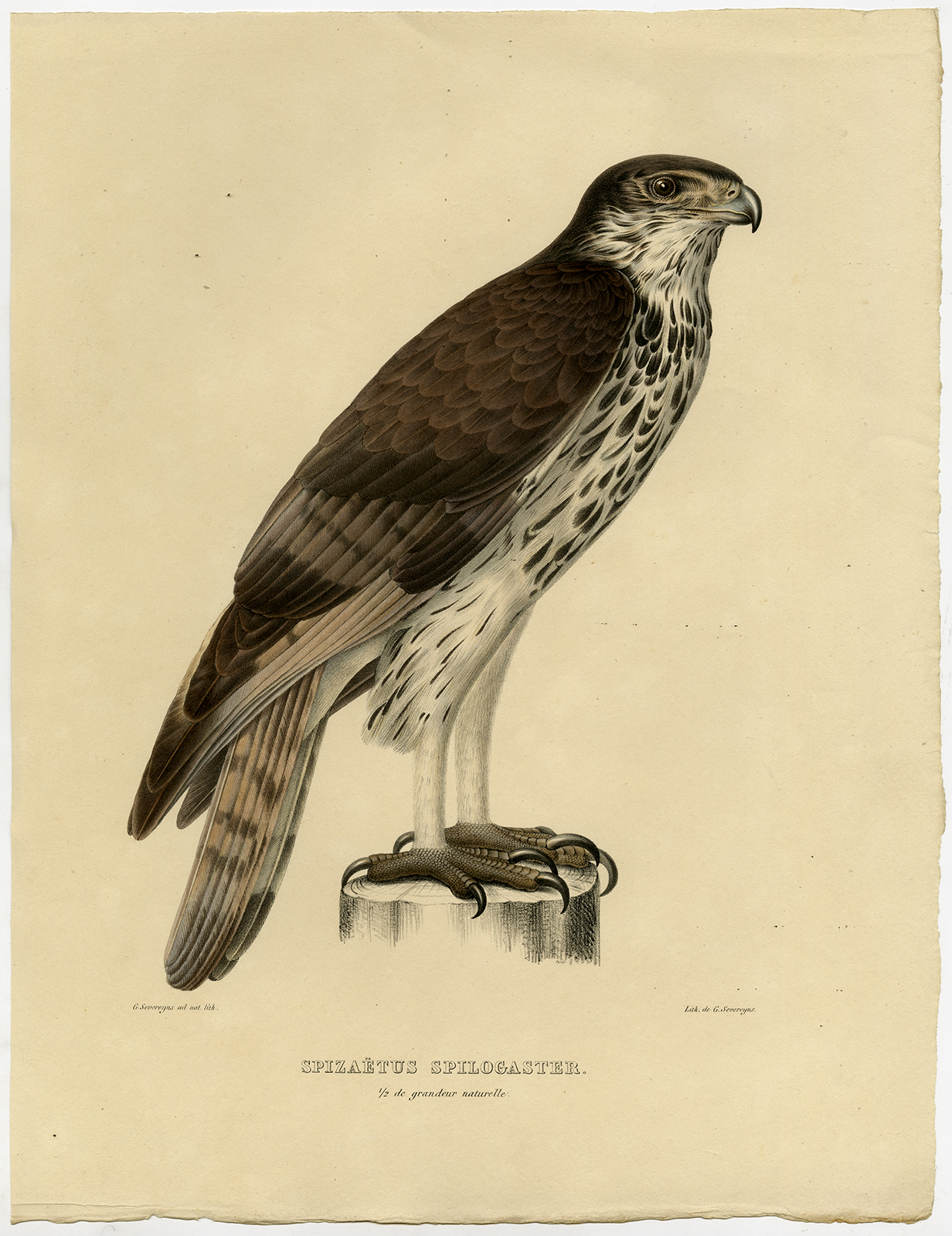 Onderwerp: Antieke prent, getiteld: ”Spizaetus spilogaster.” – Deze schaarse antieke prent toont de Afrikaanse haviksarend (Aquila spilogaster).