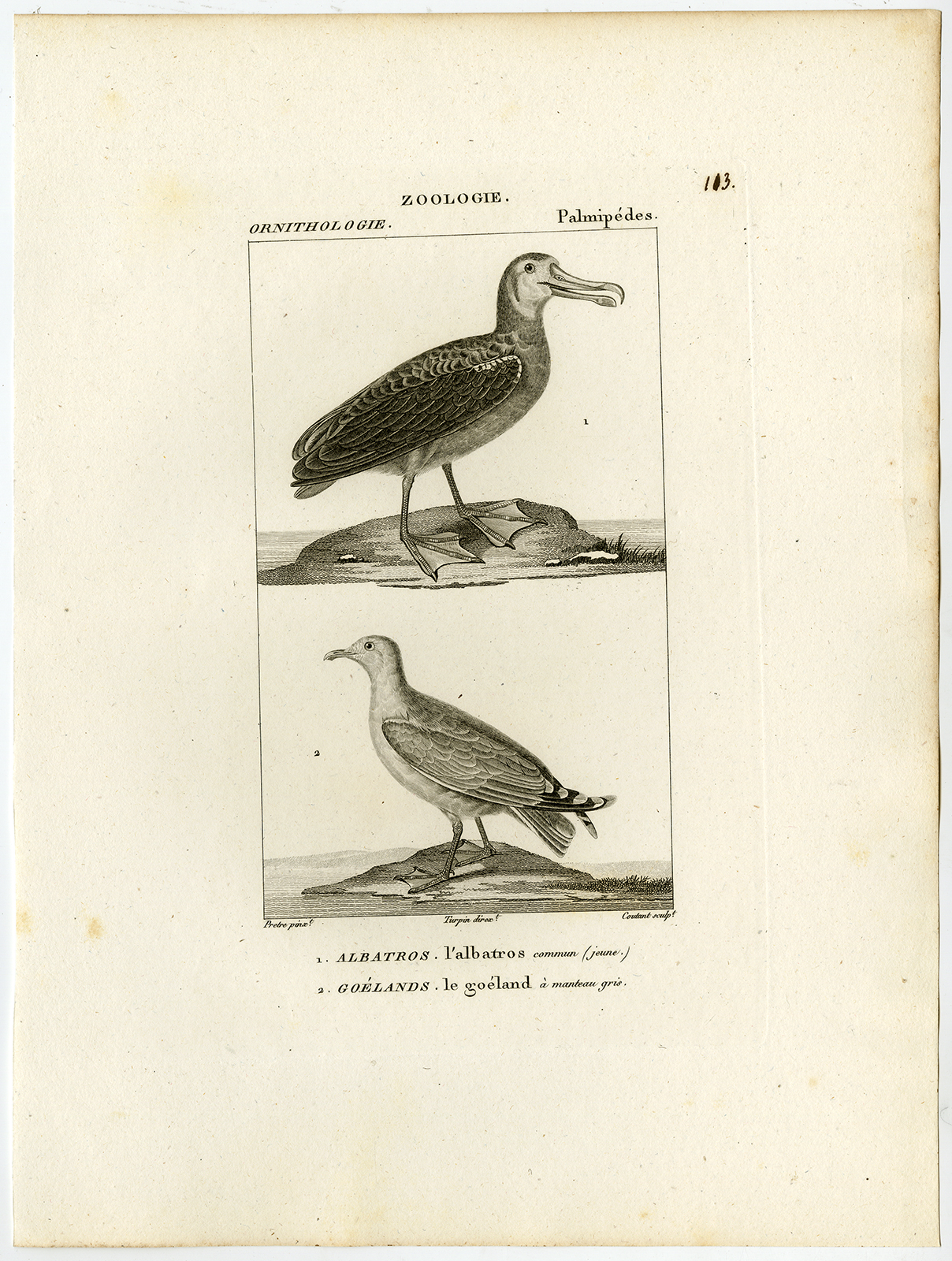 Onderwerp: Antieke prent, getiteld: ‘Pl. 113. Zoölogie, Ornithologie, Palmipedes. 1. l’Albatros commun – 2. Le Goeland een manteau gris.’ – Dit bord toont vogelsoorten; albatros en zilvermeeuw.