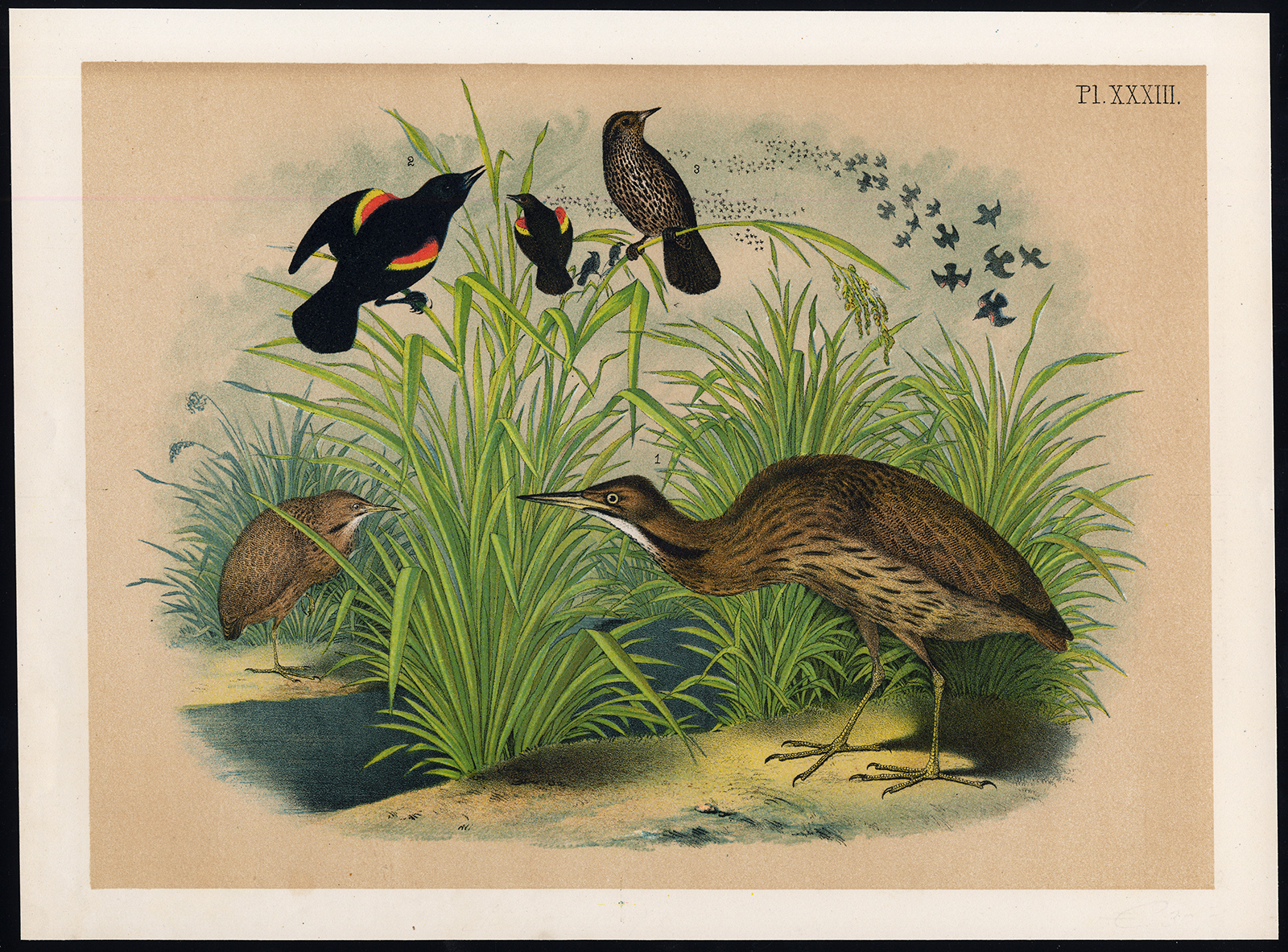 Onderwerp: Plaat XXXIII: Deze plaat toont vogelsoorten; 1. Amerikaanse roerdomp – 2-3. Roodvleugelspreeuw.