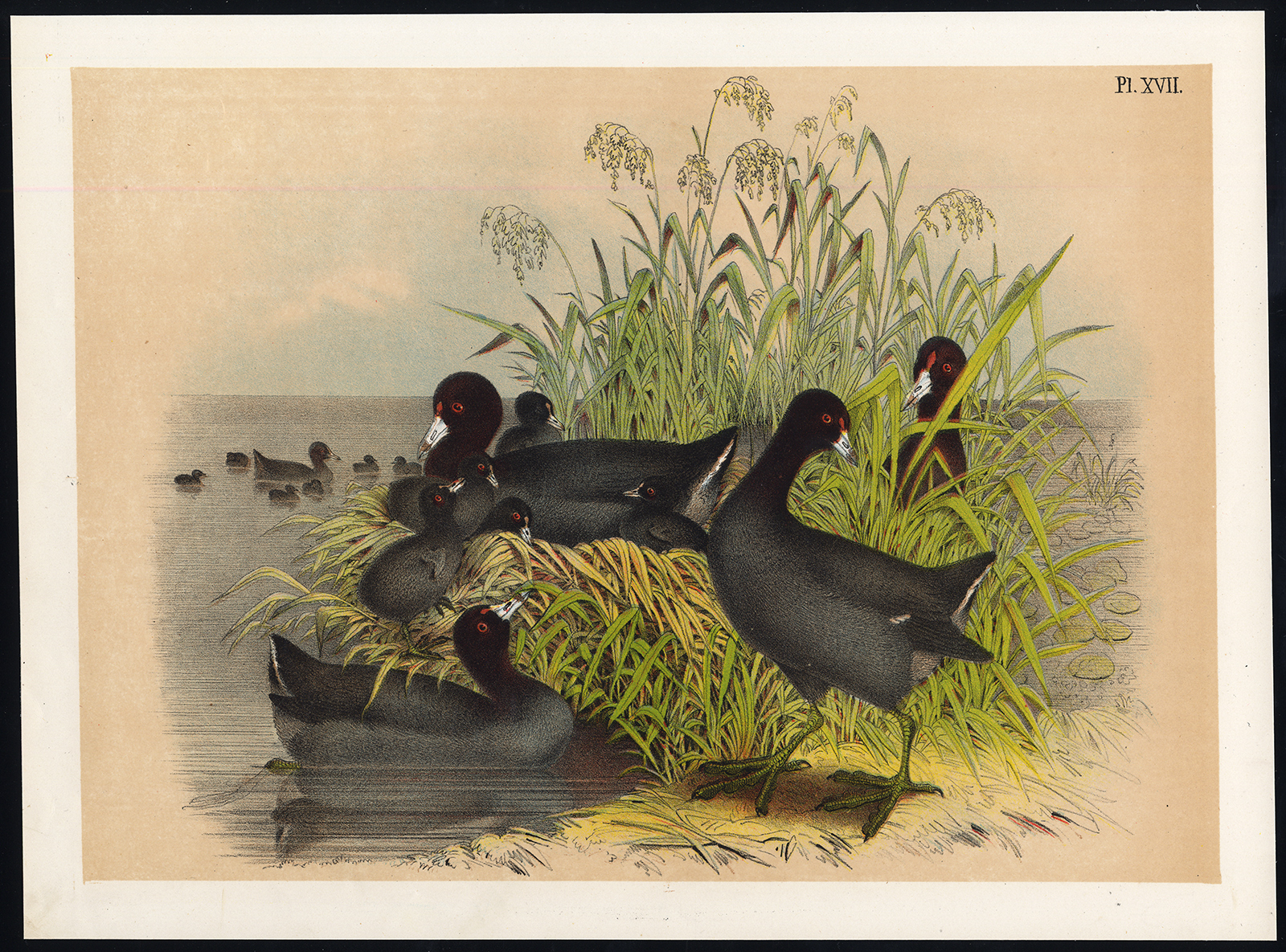 Onderwerp: Plaat XVII: Deze plaat toont vogelsoorten; Cinereous Meerkoet, Amerikaanse Meerkoet.