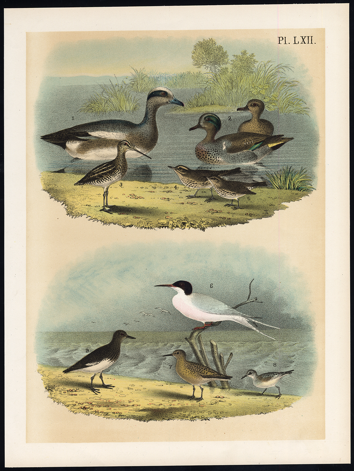 Onderwerp: Plaat LXII: Deze plaat toont vogelsoorten; 1. American Widgeon, Baldplate – 2. Green-Winged Teal – 3. American Snipe, Wilson’s Snipe – 4. Long-billed of Louisiana Water Thrush – 5. Short-Billed Water Thrush.