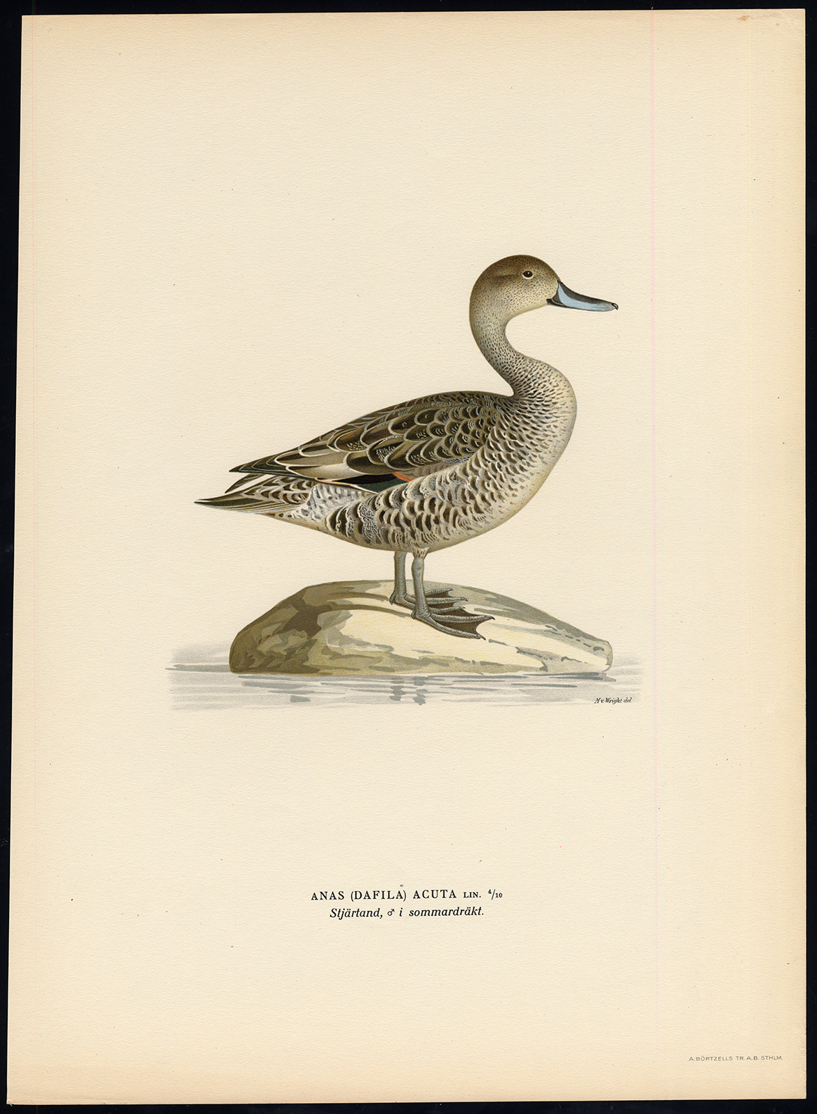 Onderwerp: Bord: ‘Anas dafila acuta Lin.’ (Anas acuta – Pijlstaart, mannetje, zomerkleed).