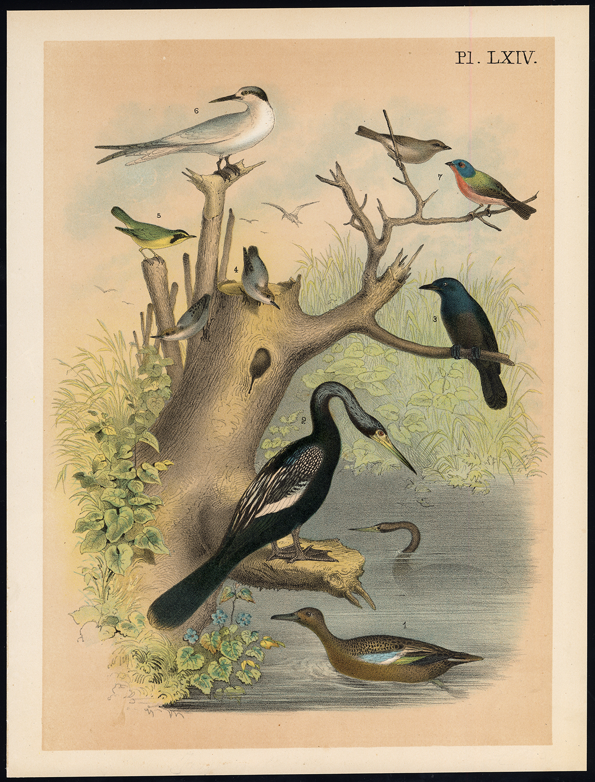 Onderwerp: Plaat LXIV: Deze plaat toont vogelsoorten; 1. Cinnamon Teal, Red-breasted Teal – 2. Anhinga, Snake-Bird, Water-Turkey, Darter – 3. Brewer’s Blackbird, Blue-headed Grackle – 4. Brown-headed Boomklever – 5. Kentucky-grasmus 6. Grote stern – 7. Geschilderde Gors, Nonpareil.
