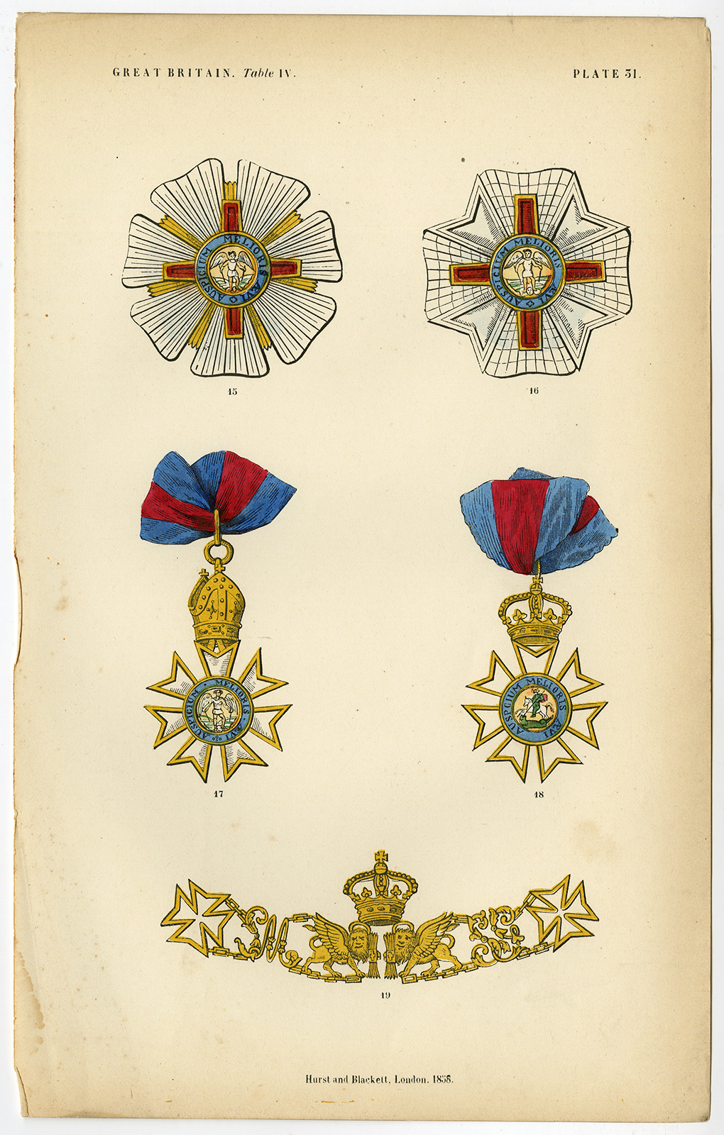 Antieke afdruk-ORDE-DECORATIE-MEDAAL-GROOT-BRITTANNIË-PLAAT 31-Burke-1858