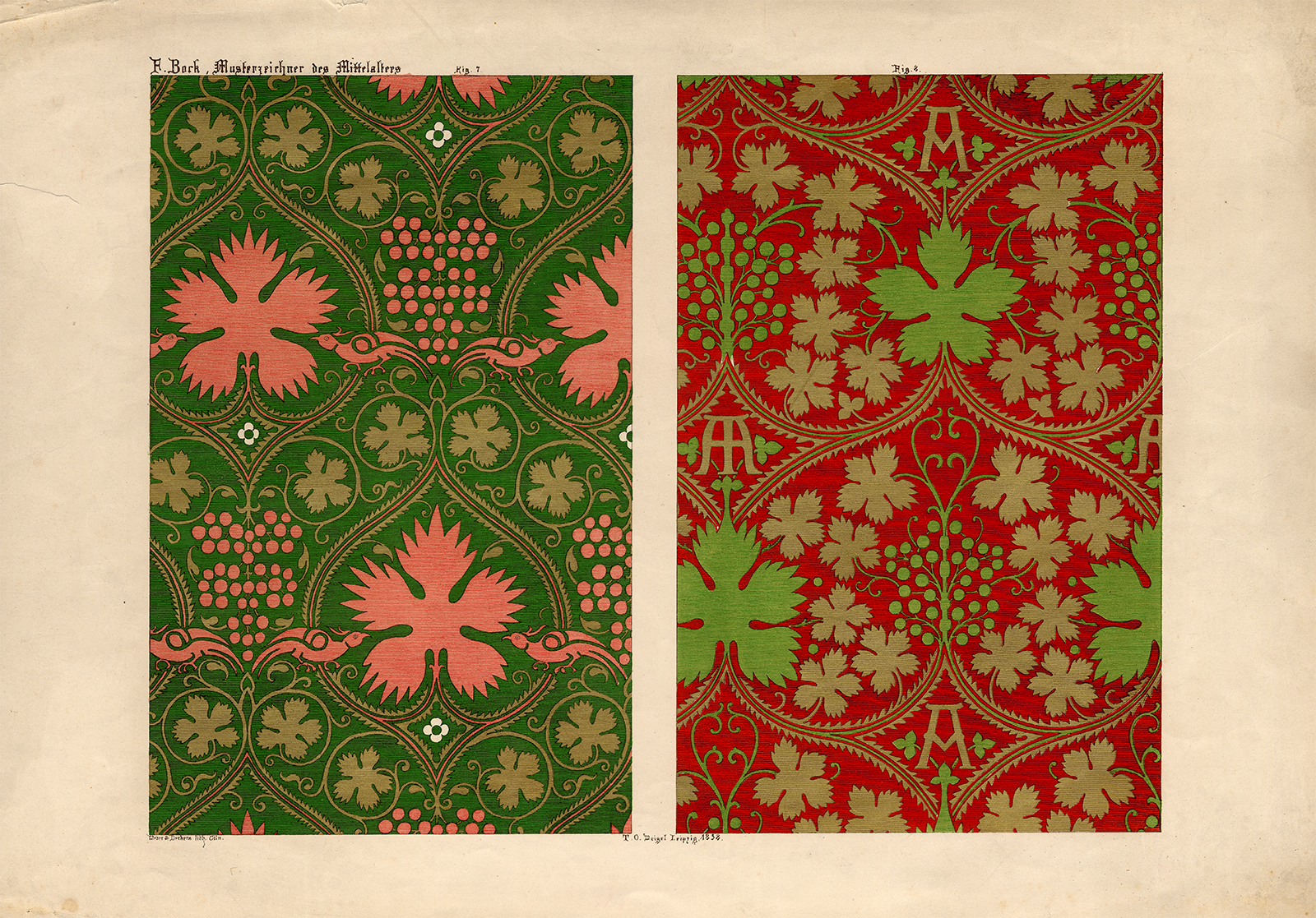 Beschrijving: Deze zeldzame antieke prent komt uit ‘Die Musterzeichner des Mittelalters’ van Franz Bock uitgegeven door Weigel in Leipzig ca. 1860. De ontwerper van de middeleeuwen. Studiegidsen voor vak- en reclamescholen, voor ornamentontwerpers, voor fabrieken van paramentunstoffen, tapijten en behangpapier, naar oude originele stoffen uit eigen collectie. De publicatie werd in delen uitgegeven door Franz Johann Joseph Bock tussen 1858-1861 . Het werd uitgegeven als losse platen.