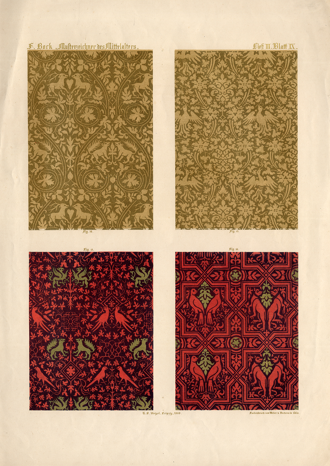 Beschrijving: Deze zeldzame antieke prent komt uit ‘Die Musterzeichner des Mittelalters’ van Franz Bock uitgegeven door Weigel in Leipzig ca. 1860. De ontwerper van de middeleeuwen. Studiegidsen voor vak- en reclamescholen, voor ornamentontwerpers, voor fabrieken van paramentunstoffen, tapijten en behangpapier, naar oude originele stoffen uit eigen collectie. De publicatie werd in delen uitgegeven door Franz Johann Joseph Bock tussen 1858-1861 . Het werd uitgegeven als losse platen.