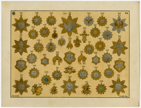 Onderwerp: Antieke druk, zonder titel. Deze antieke prent toont medailles gemaakt van goud en zilver van verschillende ordes; orde van het Gulden Vlies en anderen.