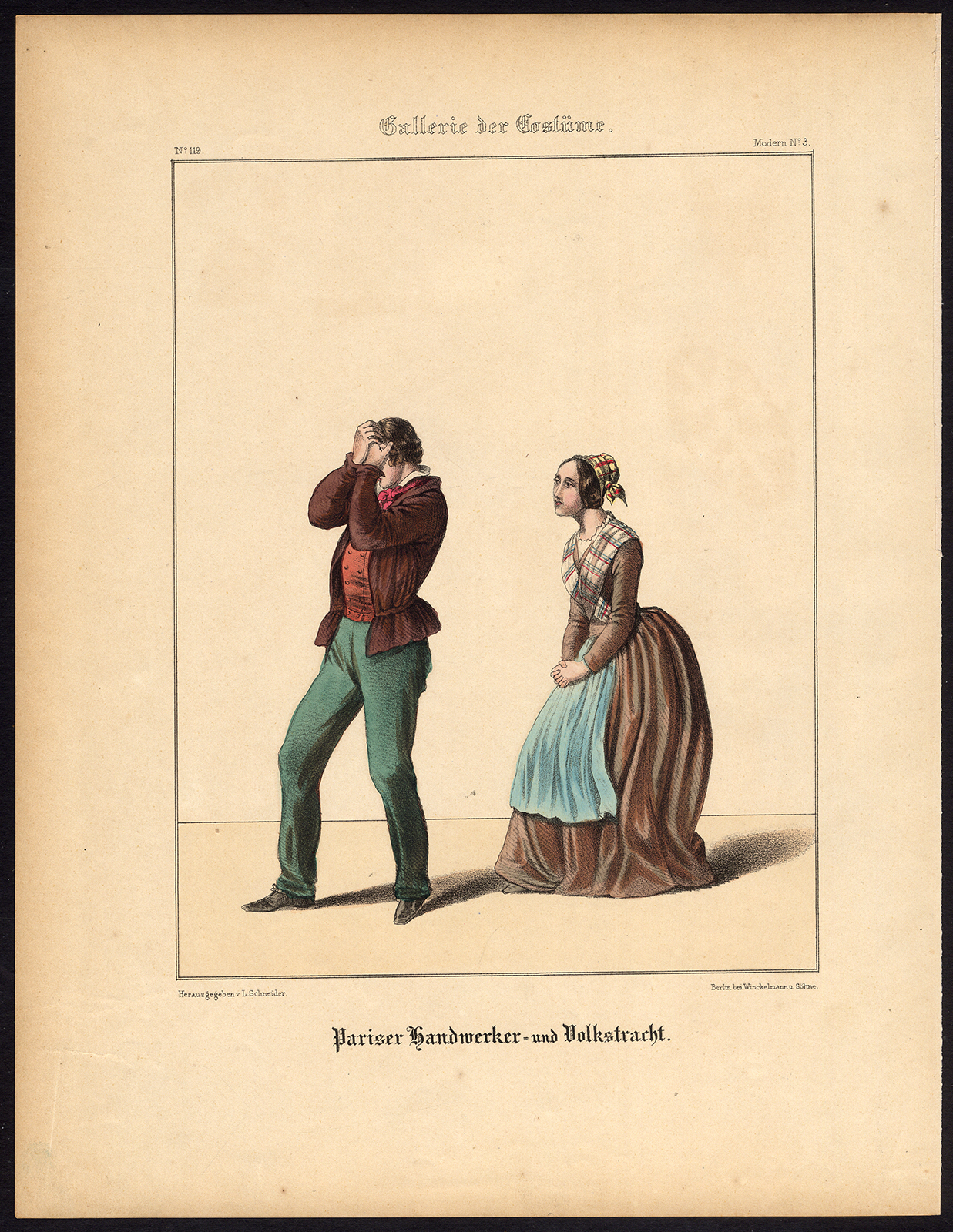 Onderwerp: Plaat: ‘Pariser Handwerker- und Volkkracht’. (Parijse arbeidersman en -vrouw in burgerkleding).