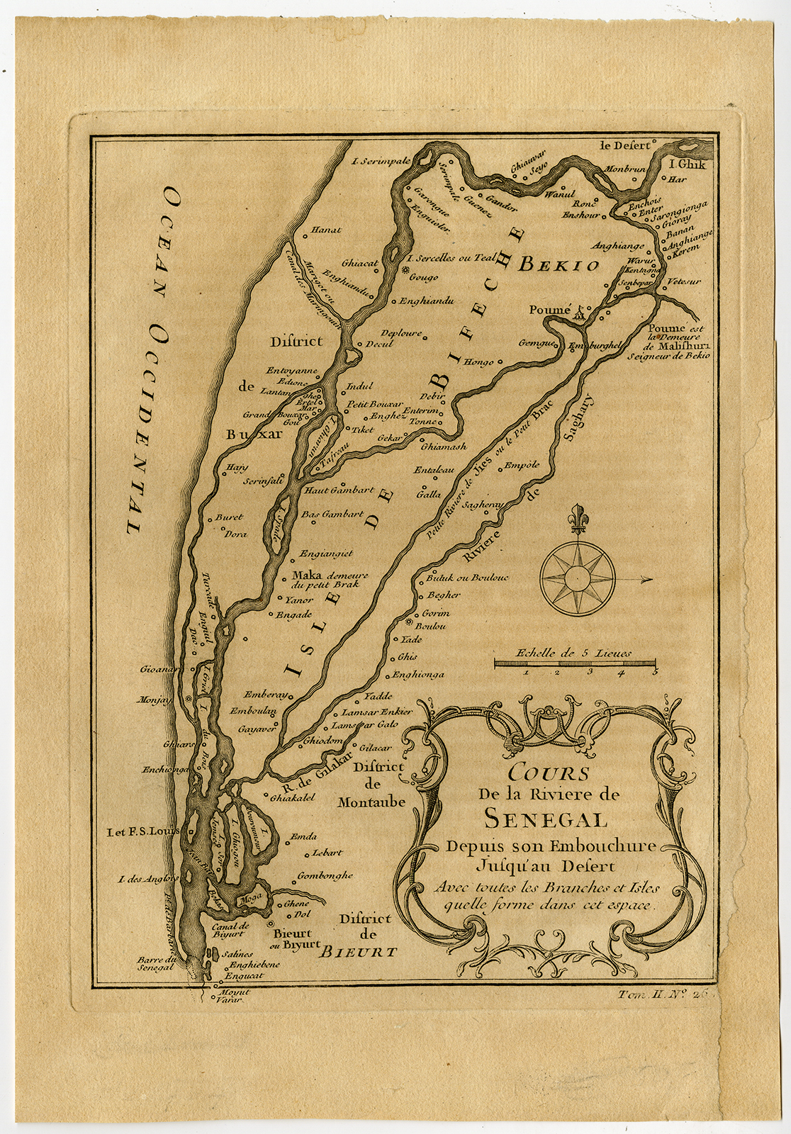 Onderwerp: Kaart: ‘Cours de la Riviere de Senegal Depuis Son Embouchure Jusqu’au Desert’. Kaart van de Senegal-rivier; met splitsingen en bars en veel van de dorpen langs de oevers. Een zeer gedetailleerde kaart.