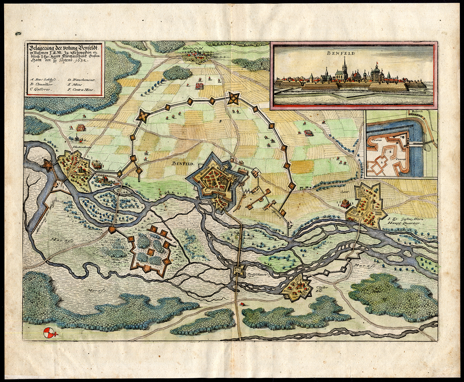 Onderwerp: Kaart: ‘Belagerung der Vestung Benfeld ..1632’. Kaart van de belegering van de vestingstad Benfeld, Frankrijk. Inzetaanzicht rechtsboven.
