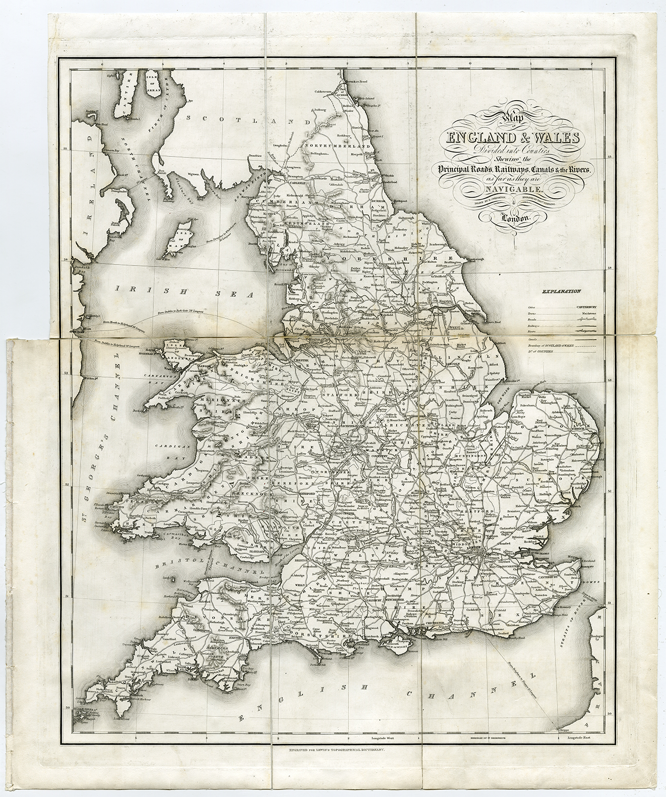 Onderwerp: Plaat: ‘Kaart van Engeland & Wales verdeeld in provincies die de belangrijkste wegen, spoorkaarten, kanalen & de rivieren voor zover ze bevaarbaar zijn’. Een gedetailleerde kaart van Engeland en Wales.