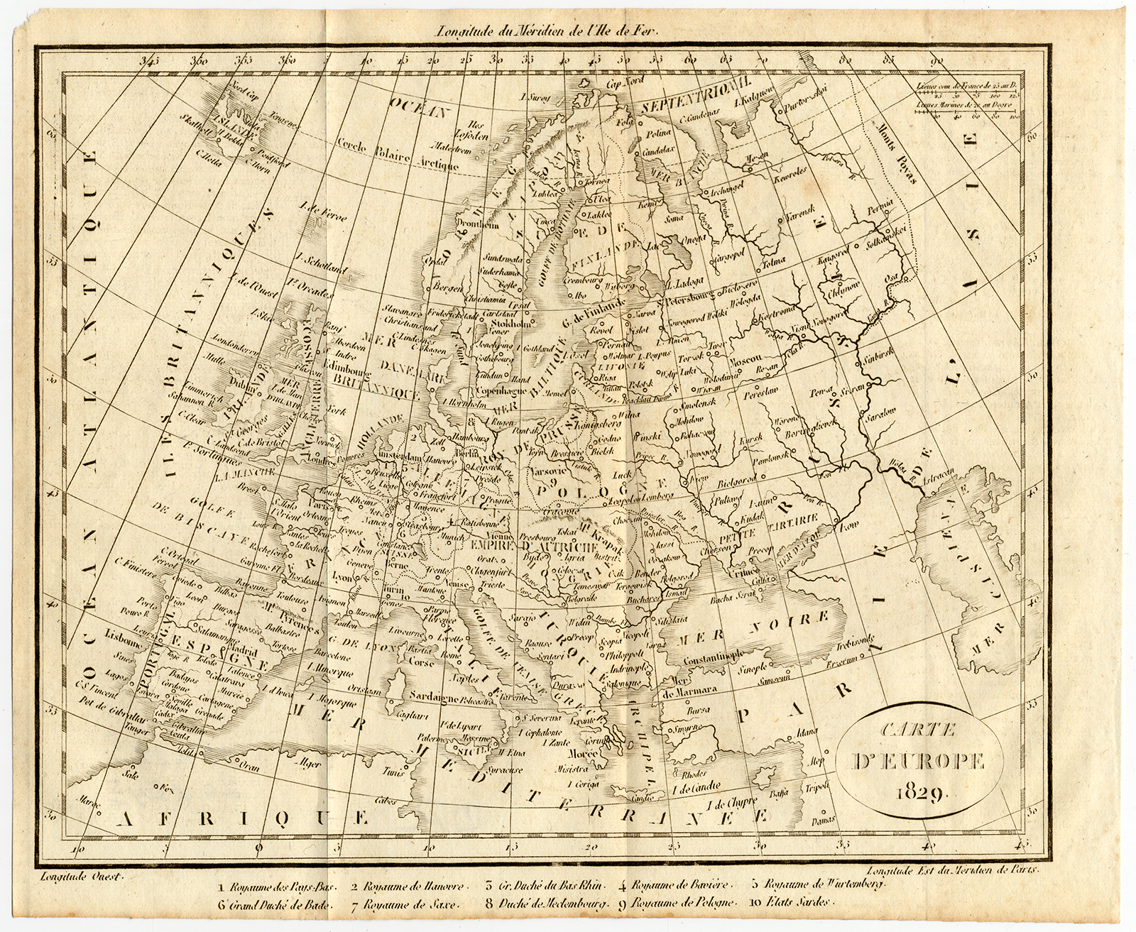 Onderwerp: Kaart: ‘Carte d’Europe 1829’. Deze kaart toont het continent Europa. Toets in ondermarge.