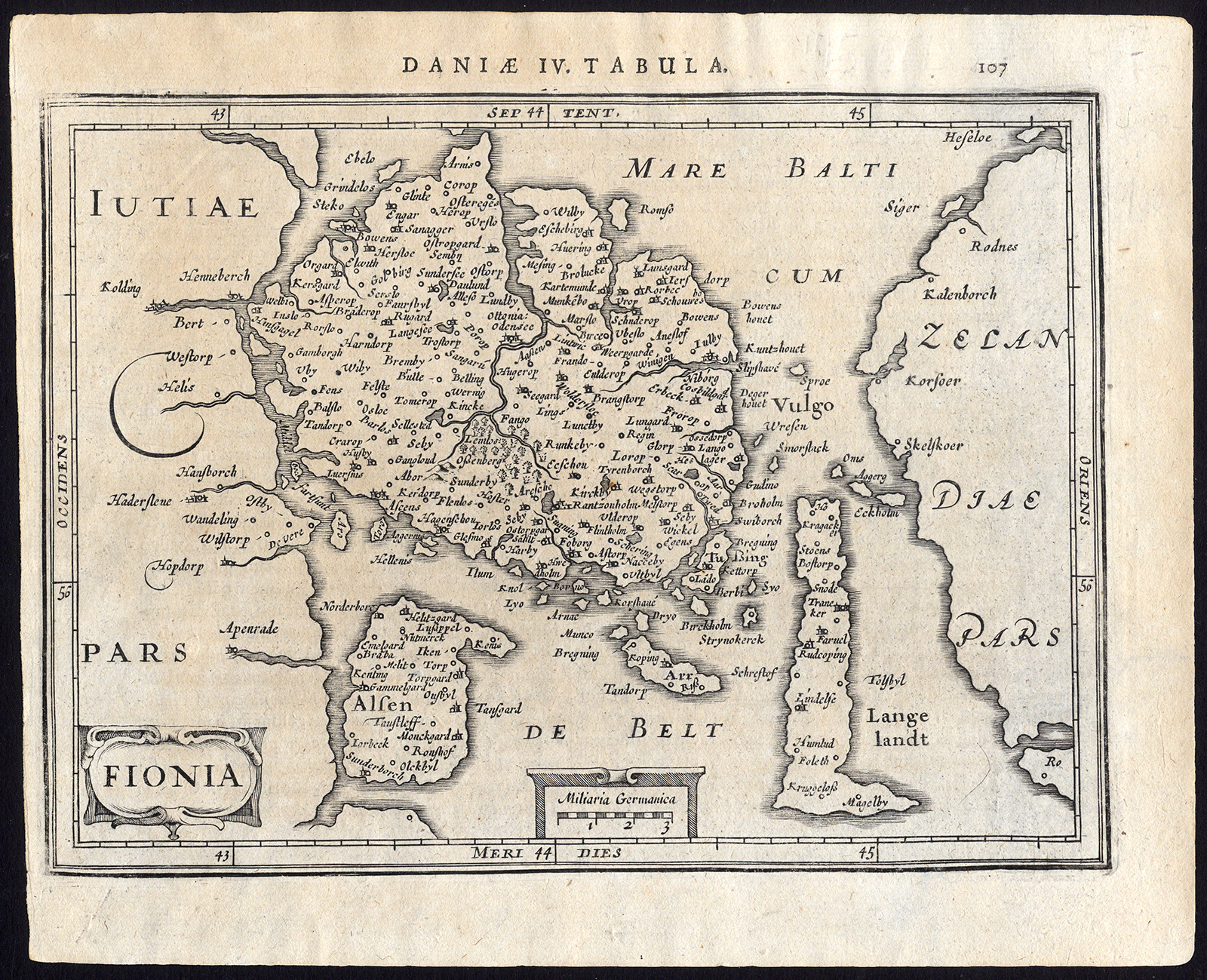 Onderwerp: Kaart : ‘Fionia.’ Kaart van Fyn en zijn satellieteilanden Aero, Als en Langeland – Denemarken. Met titelcartouche en schaal.