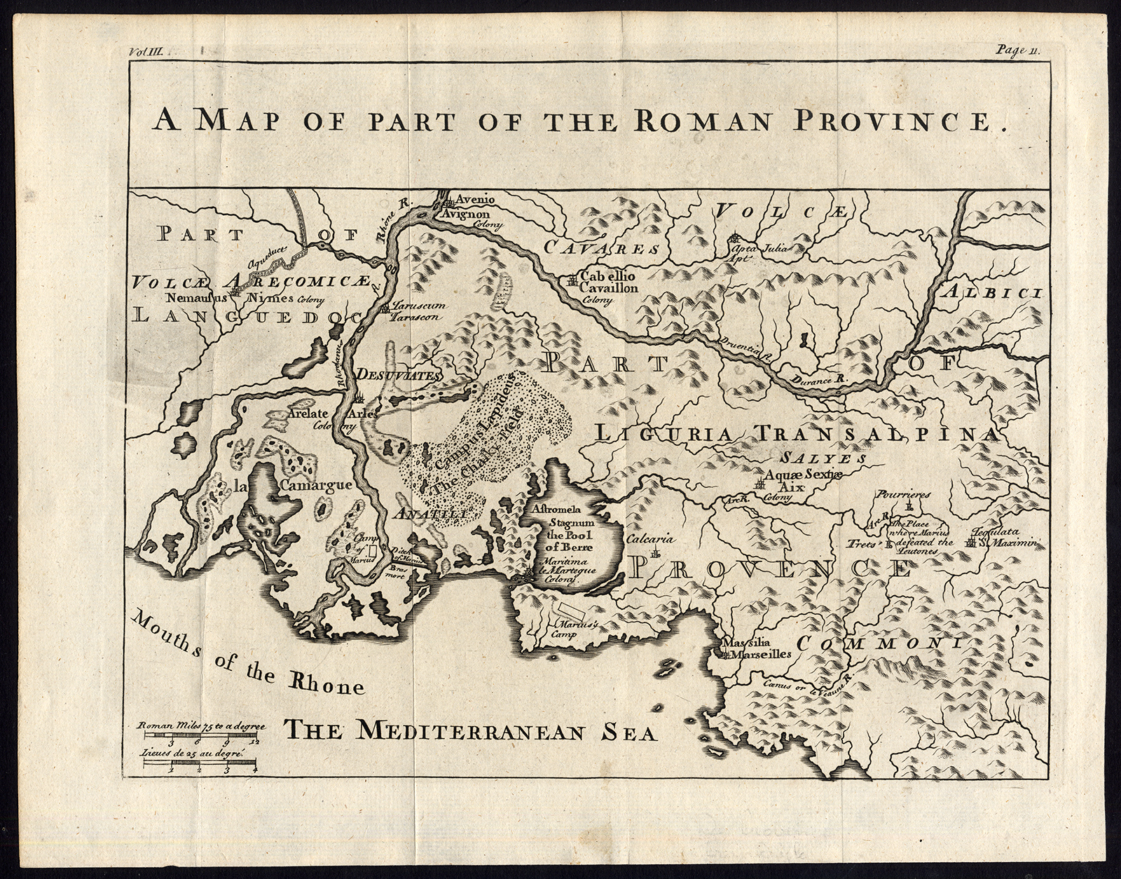 Onderwerp: Kaart: ‘Een kaart van een deel van de Romeinse provincie’. Historische kaart van de Provence in Frankrijk.