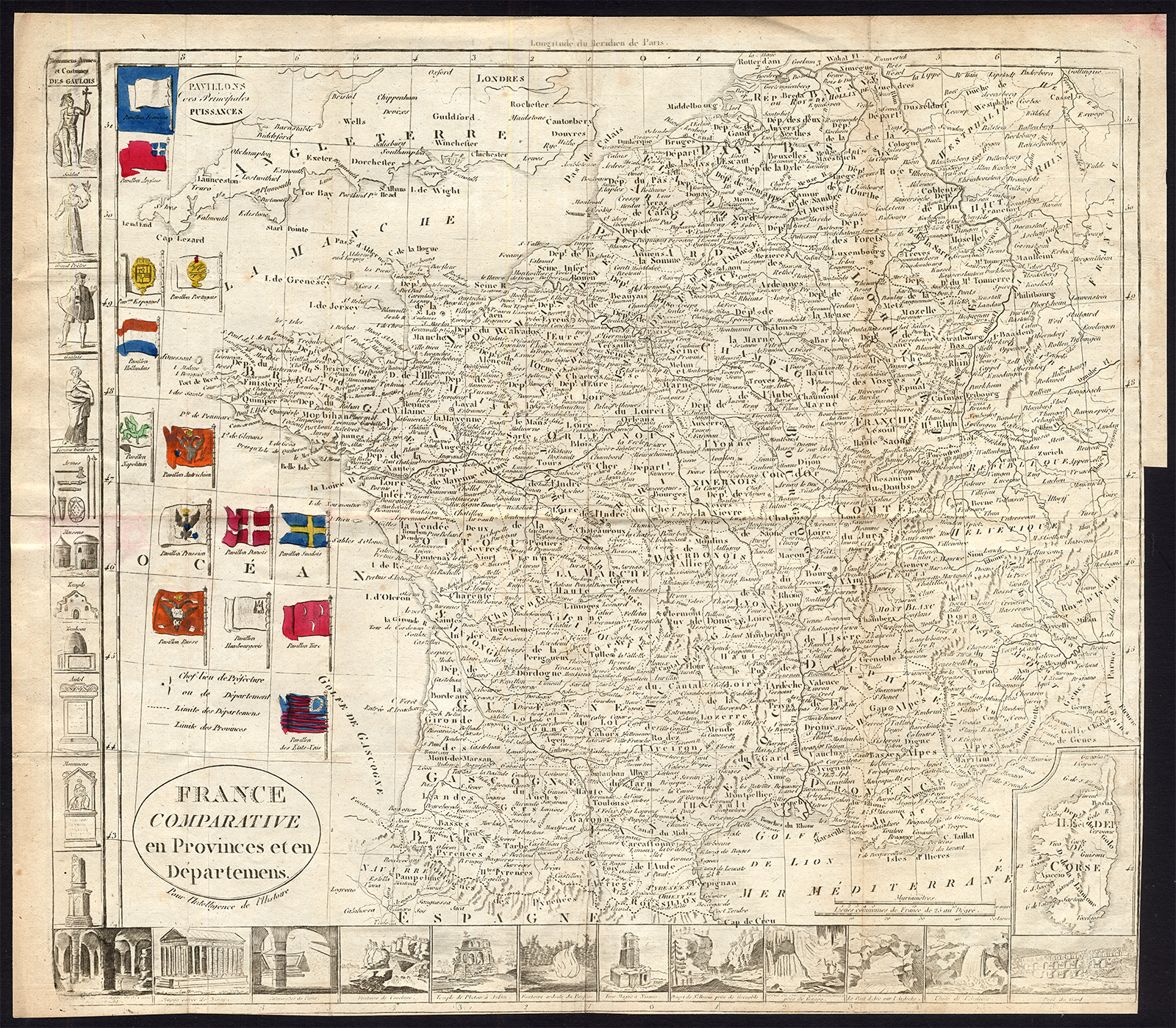 Onderwerp: Kaart: ‘France Comparative en Provinces et en Departemens pour l’Intelligence de l’Histoire’. Ongewone kaart van Frankrijk met een inzetkaart van Corsica. Panelen, aan zijkanten en onderkant, met vignetten van monumenten, scènes, gekostumeerde figuren, enz. Vlaggen van Europese mogendheden getoond in de Atlantische Oceaan.