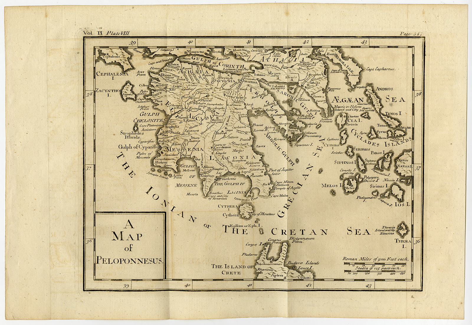 Onderwerp: Plaat VIII: ‘Een kaart van Peloponnesus’. Mooie gedetailleerde kaart van de oude regio Peloponnesos in Griekenland.