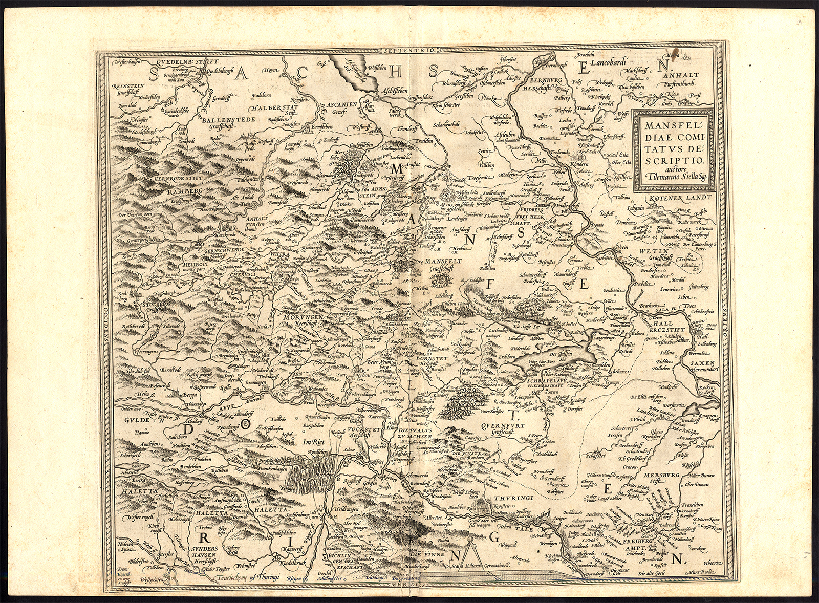 Onderwerp: Kaart: ‘Mansfeldiae Comitatus Descriptio, auctore Tilemanno Stella Sig.’ Aantrekkelijke regionale kaart van Duitsland concentreert zich op Mansfeld en Eisleben met mooie details langs de rivieren Wipper en Saale. De kaart is grafisch gegraveerd om de bossen en moerassen te illustreren en gevuld met plaatsnamen. De kaart is gebaseerd op de cartografie van Stella en Mellinger. Nederlandse tekst op verso. Aan de linkerkant op verso een handgeschreven tekst.