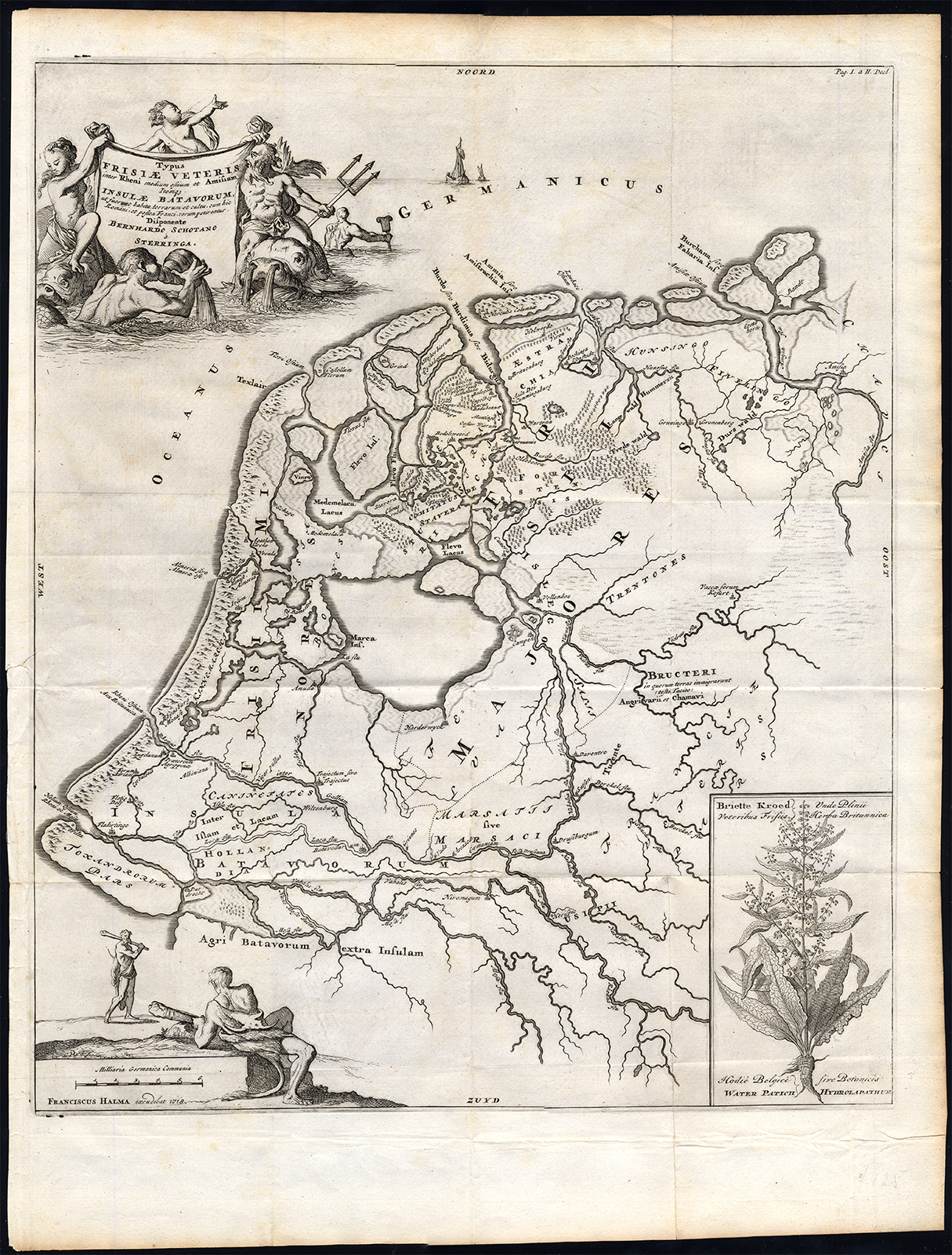 Onderwerp: Kaart : ‘Typus Frisiae Veteris : inter Rheni medium ostium et Amisiam Itemque, Insulae Batavorum ´?¢ Disponente Bernhardo Schotano a Sterringa.’ Historische kaart van Friesland uit Halma’s editie van Bernard Schotanus van Sterringa’s Atlas of Friesland. In deze editie heeft Halma deze historische kaart van Schotanus toegevoegd, plus zeven andere historische kaarten van Menso Alting. De kaart bevat een inzet van de Briette Kroed (Rumex hydrolapathum), een plant die inheems is in de vennen en rivieroevers in de hele regio. De kaart is verfraaid met taferelen van Neptunus en zijn entourage rond de titelcartouche en twee Wildmen met hun knuppels op de afstandsschaalcartouche.