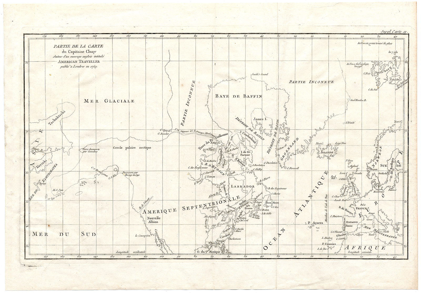Onderwerp: Kaart: ‘Partie de la carte du Capitaine Cluny, Auteur d’un ouvrage anglois intitule American Traveler publie a Londres en 1769.’ Kaart van Amerika en delen van Europa en Azië. Gebaseerd op de mythische reis van kapitein Cluny.