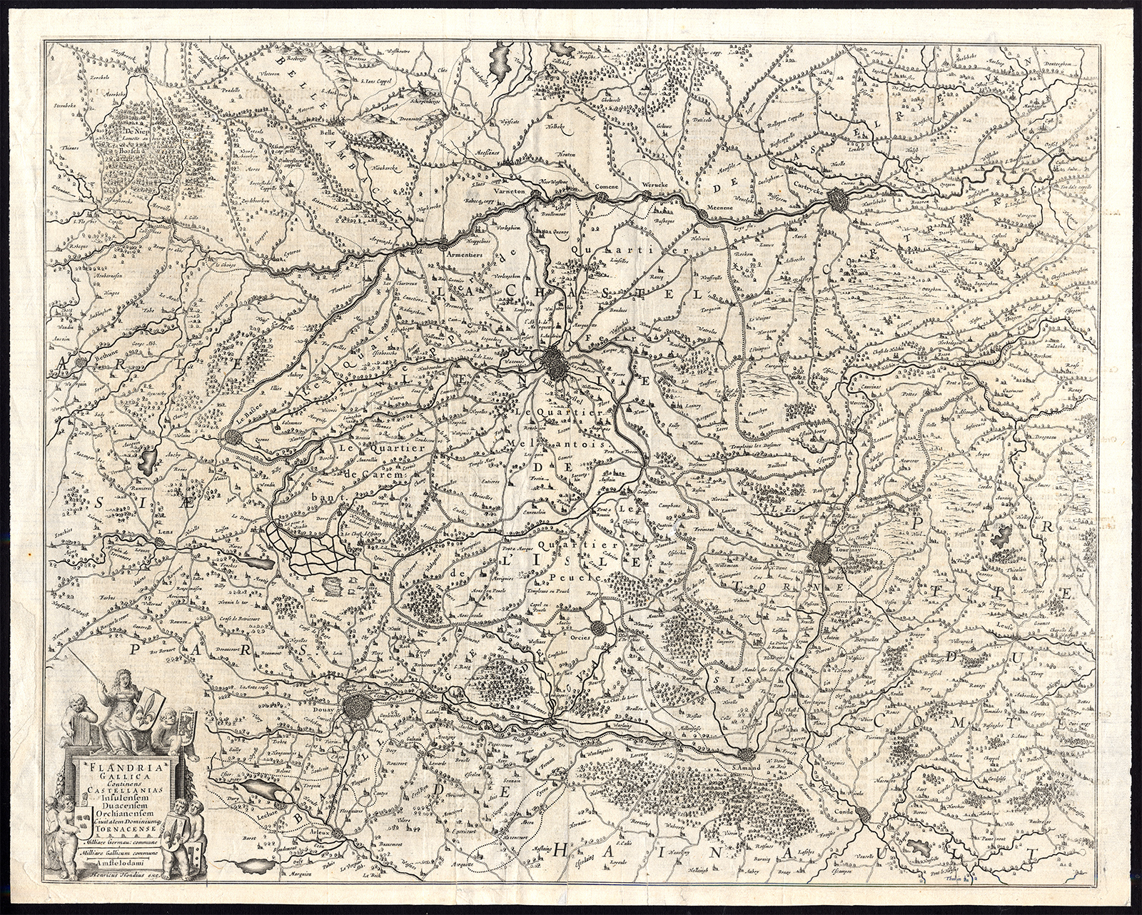 Onderwerp: Kaart: ‘Flandria Gallica Continens Castellanias Insulensem Duacensem Orchianensem.’ Gedetailleerde kaart van historisch Vlaanderen, volledig gegraveerd met rivieren, dorpen, bossen en ommuurde steden. Omvat de steden Douai, Lille en Doornik, beschrijft de loop van talrijke rivieren en noemt honderden dorpen. Nederlandse tekst op verso.