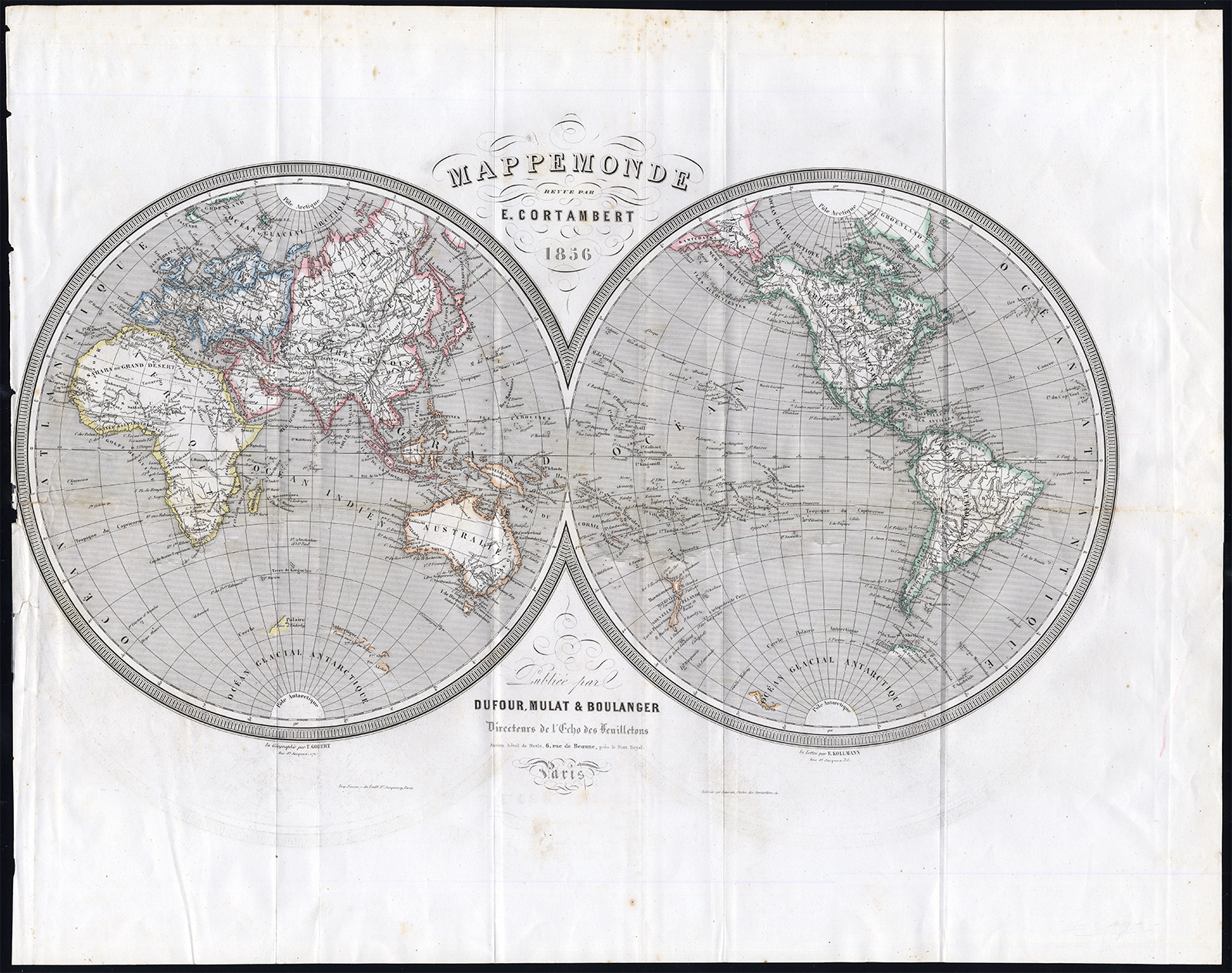 Onderwerp: Kaart : ‘Mappemonde revue door E. Cortambert 1864.’ (Wereldkaart.) Dubbel halfrond Wereldkaart.