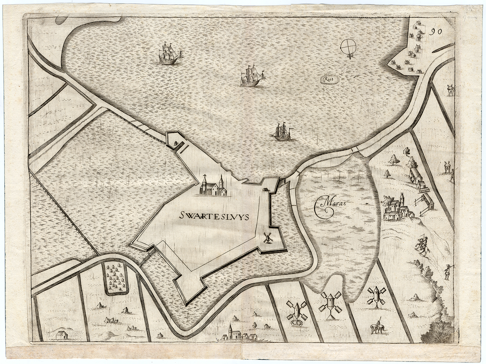 Onderwerp: Plattegrond: ‘Swartesluys.’ Plattegrond van de vestingstad Zwartsluis in Nederland. Met schepen op de Zuiderzee.