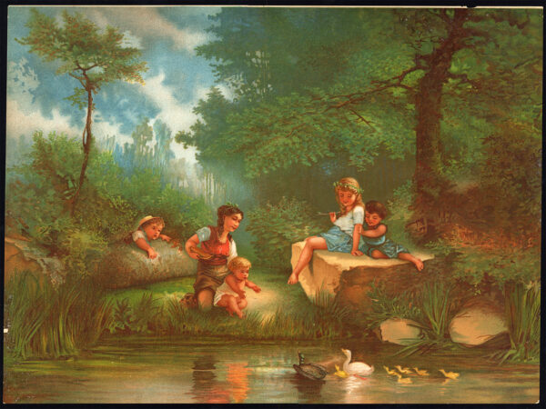 Onderwerp: Originele print van een groep van twee meisjes en drie peuters die hun tijd doorbrengen in een bos. Ze staan bij een vijver waarin een paar eenden en hun eendjes reikhalzend wachten op de broodkruimels waarmee twee van de kinderen hen te eten geven.