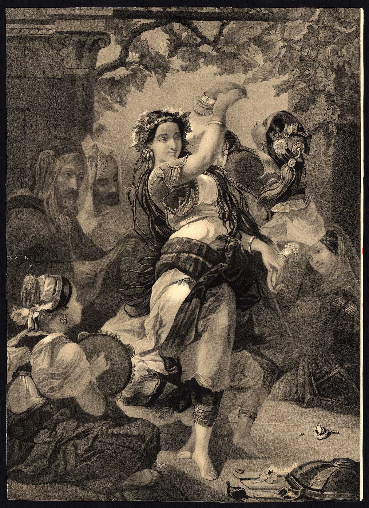Antieke Master Print-DANCING-MUZIEK-ARABISCH-DRUM-Lithografie-c. 1850