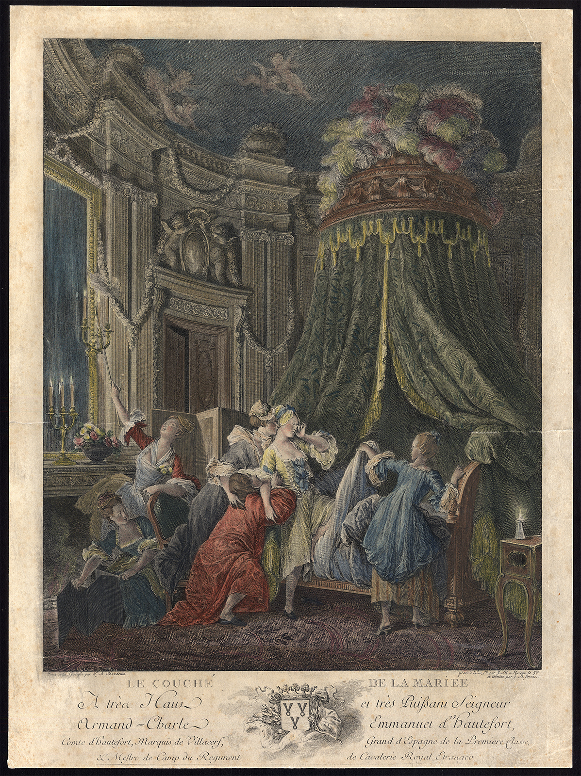 Onderwerp: Plaat: ‘Le Couche de la Mariee’, (Het bed van de getrouwde vrouw.) Een vrouw en haar man, vergezeld van verschillende dienstmeisjes, gaan naar bed voor hun huwelijksnacht.