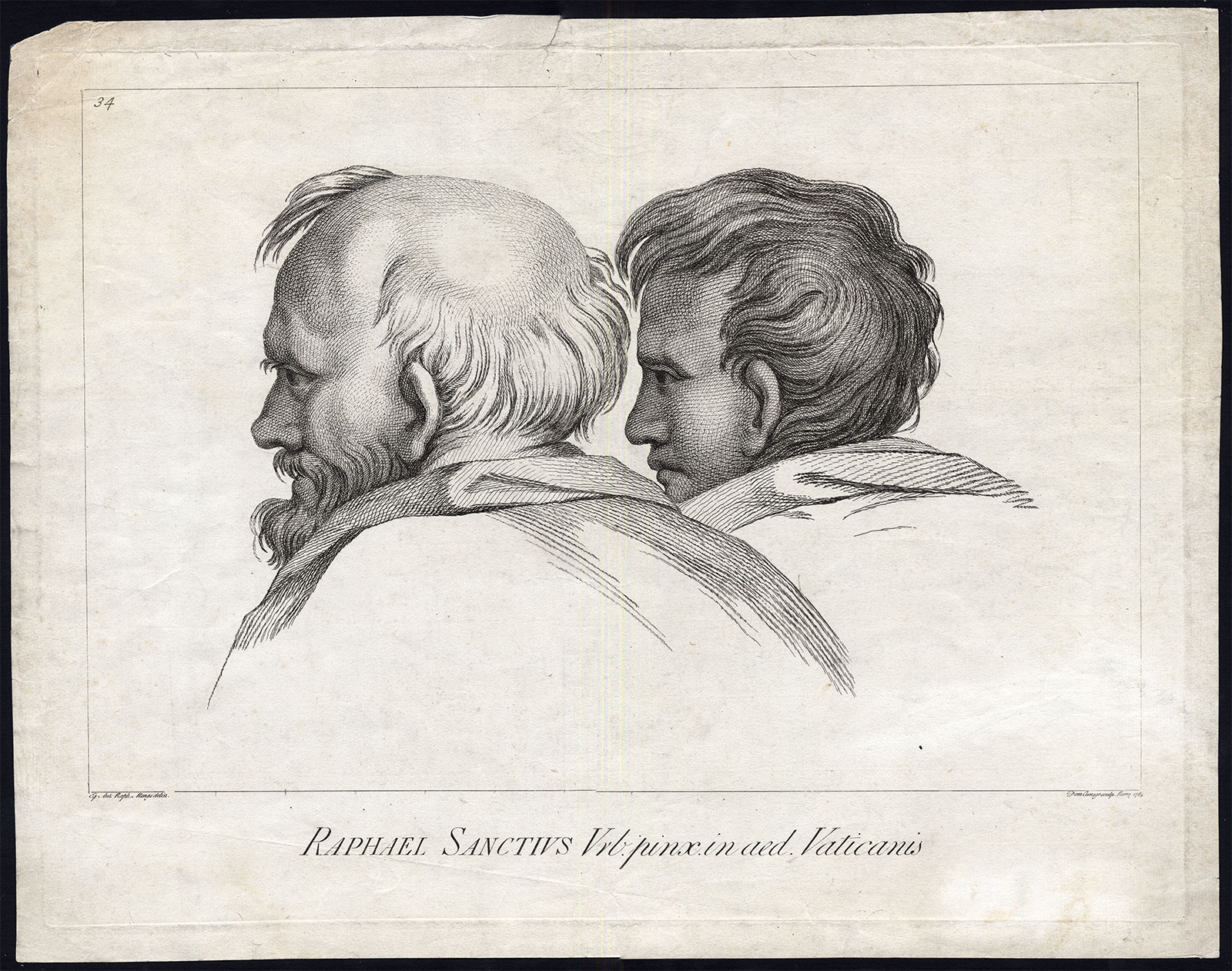 Onderwerp: Originele masterprint, getiteld: ‘Raphael Sanctius Urbinas Pinx in aed Vaticanas’. Het toont twee mannenhoofden (mogelijk vader en zoon, de gelijkenis is treffend) van achteren gezien. Deze twee hoofden maken deel uit van Rafaëls beroemde fresco ‘De School van Athene’.