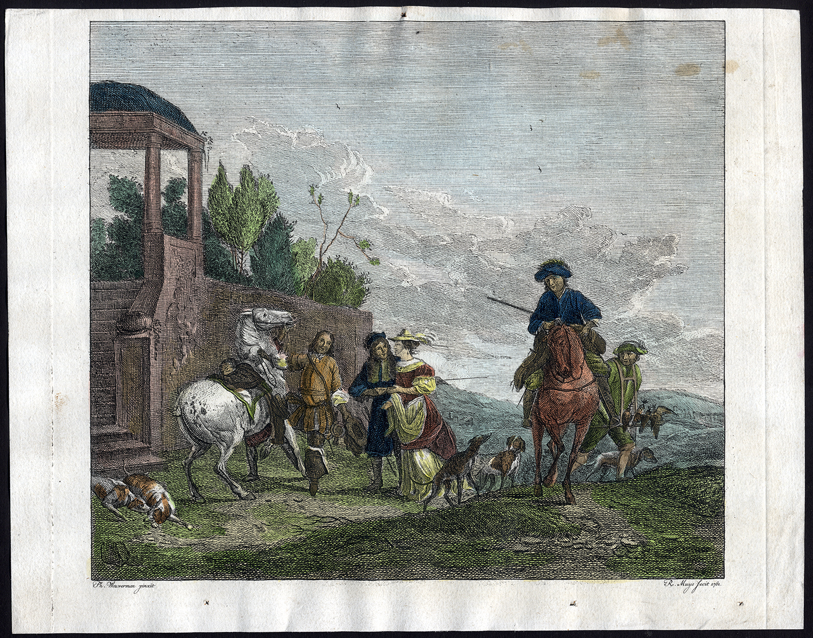 Antieke Meesterdruk-JACHT-JAGER-HOND-PAARD-VALKONIJ-Muys-Wouwerman-1761