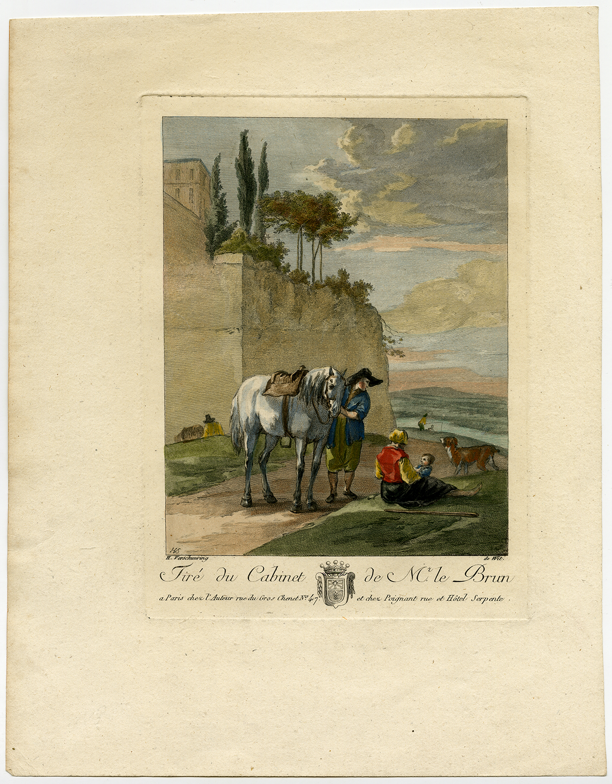 Onderwerp: Plaat: ‘Tire du Cabinet de Mr. Le Brun.’ (Uit het kabinet van de heer Le Brun). Gravure naar het originele schilderij van Willem Verschuring. Afgebeeld is een scène met een man die naast een paard staat, een vrouw en kind zitten op de grond. Op de achtergrond is een man aan het vissen.