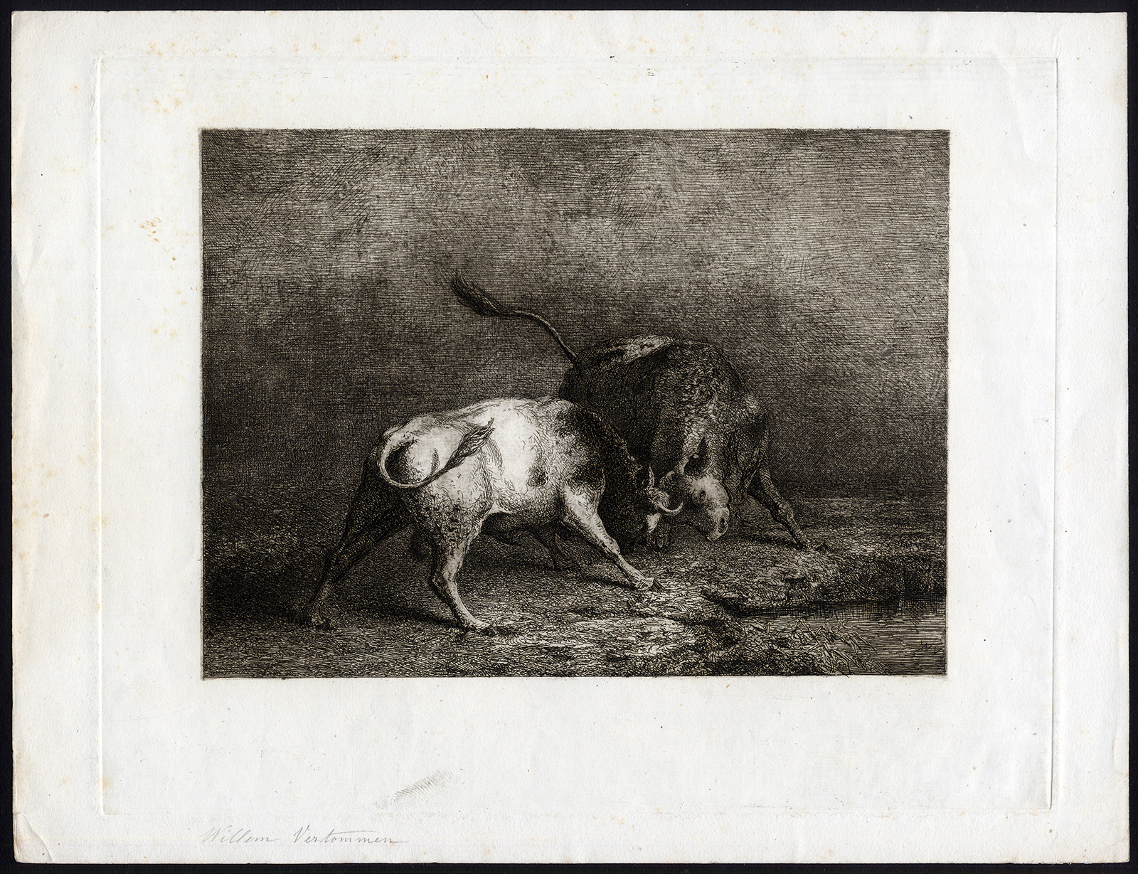 Antieke Meesterdruk – VECHTENDE STIEREN – Vertommen – 1850