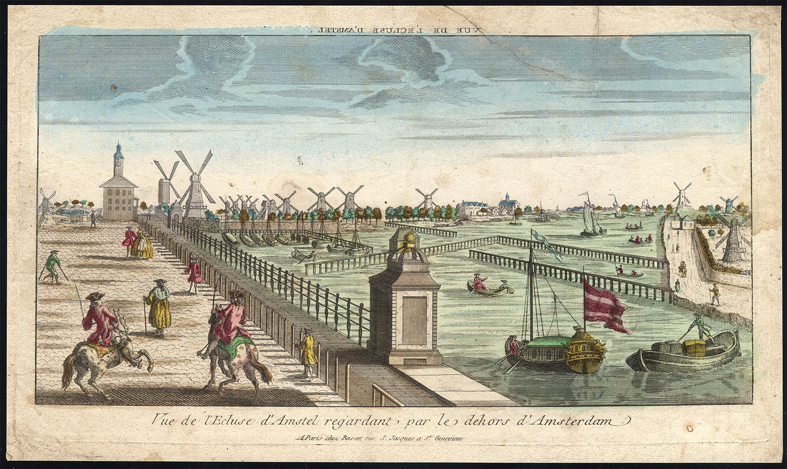 Onderwerp: Plaat: ‘Vue de l’Ecluse d’Amstel betreffende par le dehors d’Amsterdam.’ Deze optische print toont een zicht op de Amstelsluis gezien vanaf de buitenkant van Amsterdam.