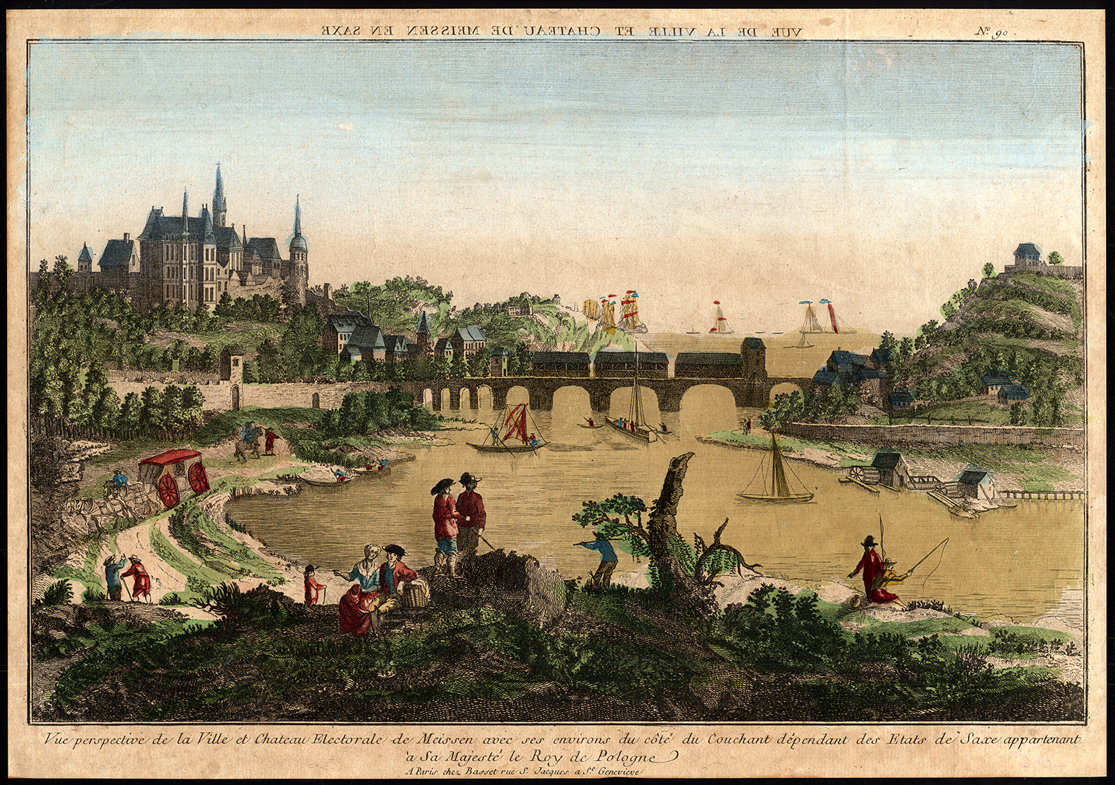 Onderwerp: Plaat: ‘Vue perspective de la Ville et Chateau Electorale de Meissen avec ses omgeving du cote du Couchant dependance des Etats de Saxe appartenant a sa Majeste le Roy de Pologne.’ Deze optische prent toont een gezicht op de Duitse stad Meissen aan de rivier de Elbe bij Dresden.