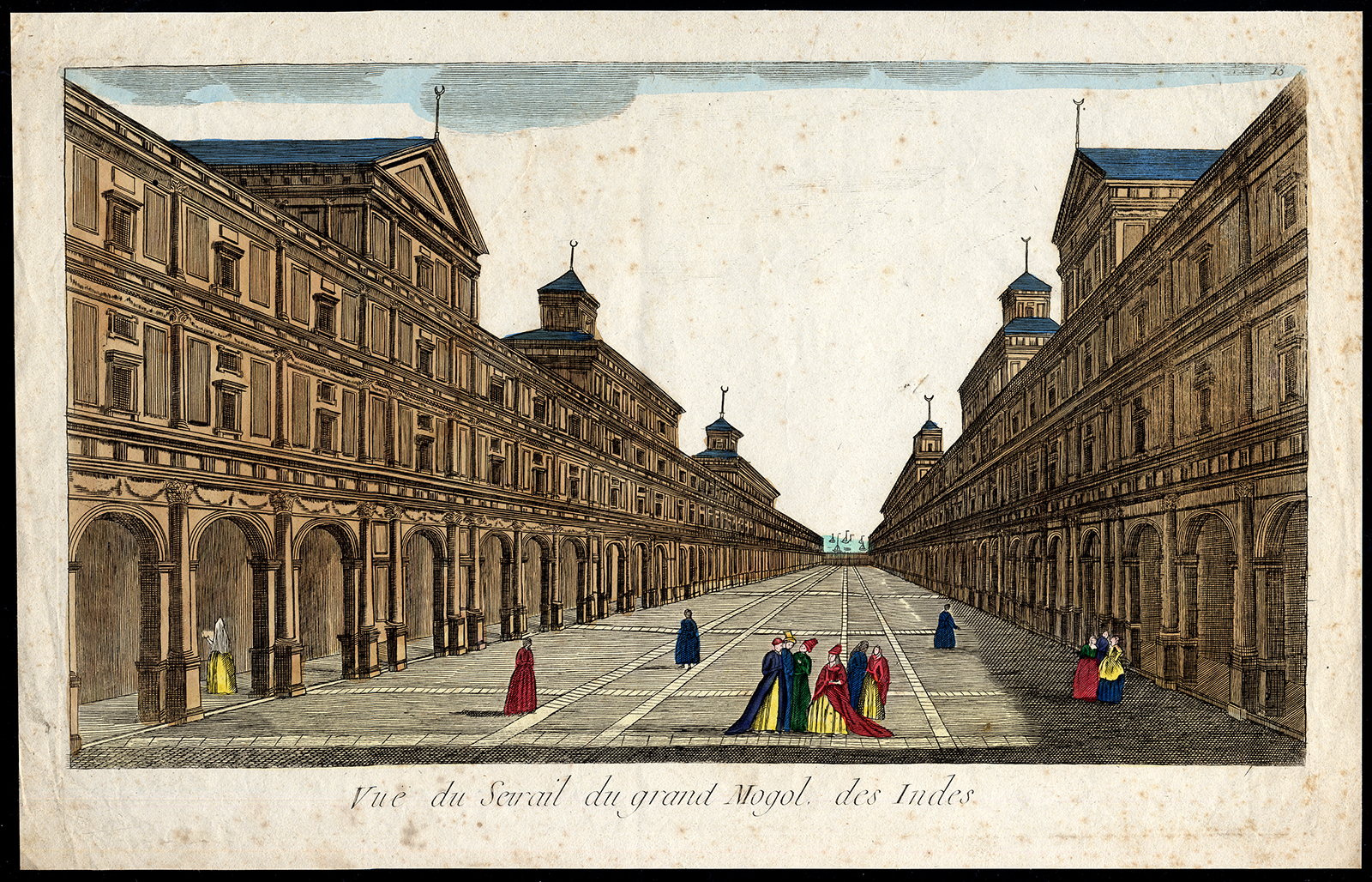 Onderwerp: Bord: ‘Vue du serail du grand Mogol, des Indes.’ Deze optische print toont een Mogulpaleis in India.