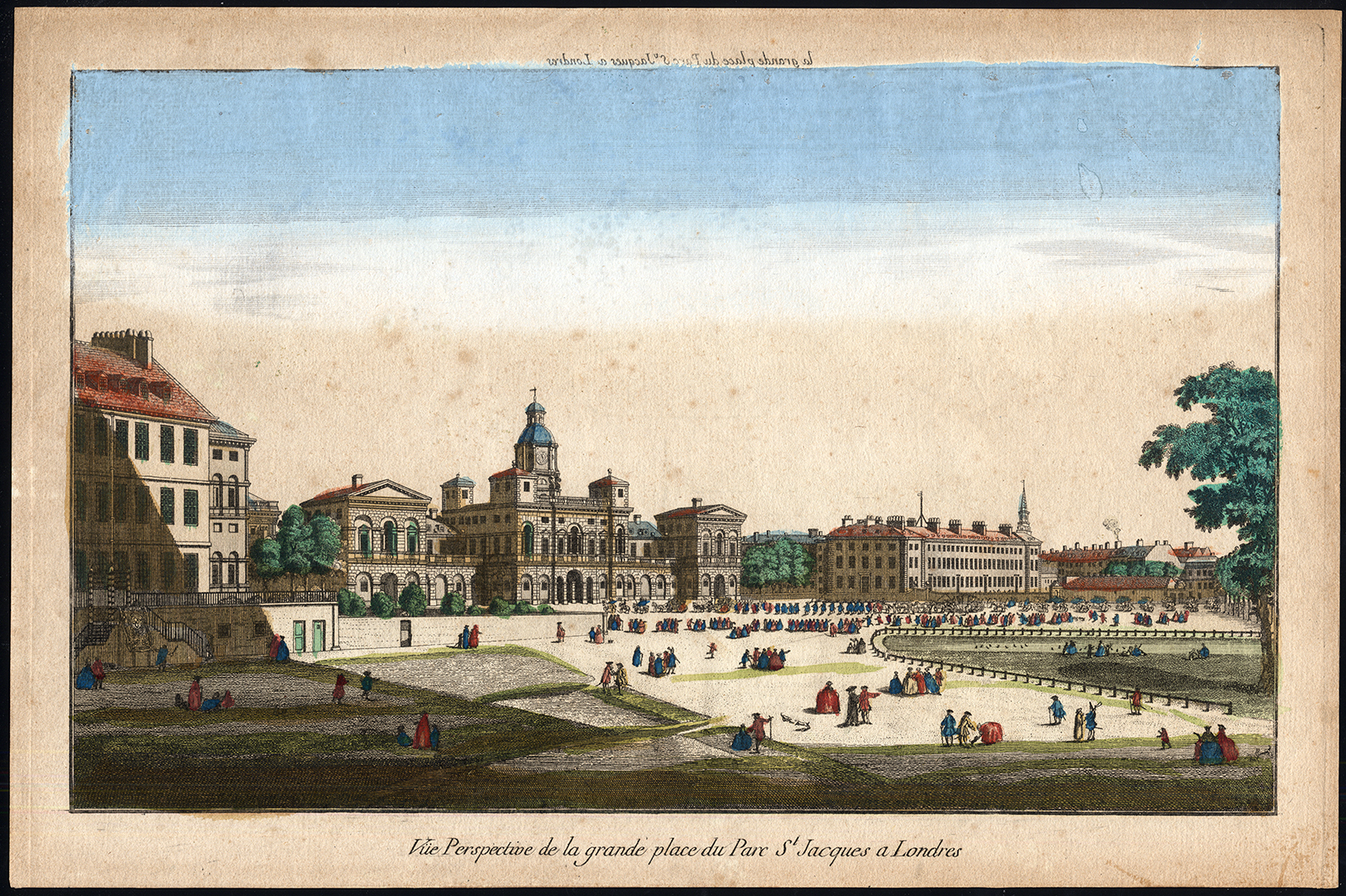 Onderwerp: Bord: ‘Vue Perspective de la grande Place du Parc St. Jacques a Londres.’ Deze optische print toont een zicht op St. James’s Park in Londen. Op de achtergrond zijn de Oude Admiraliteit en de Paardenwachtersparade te zien.