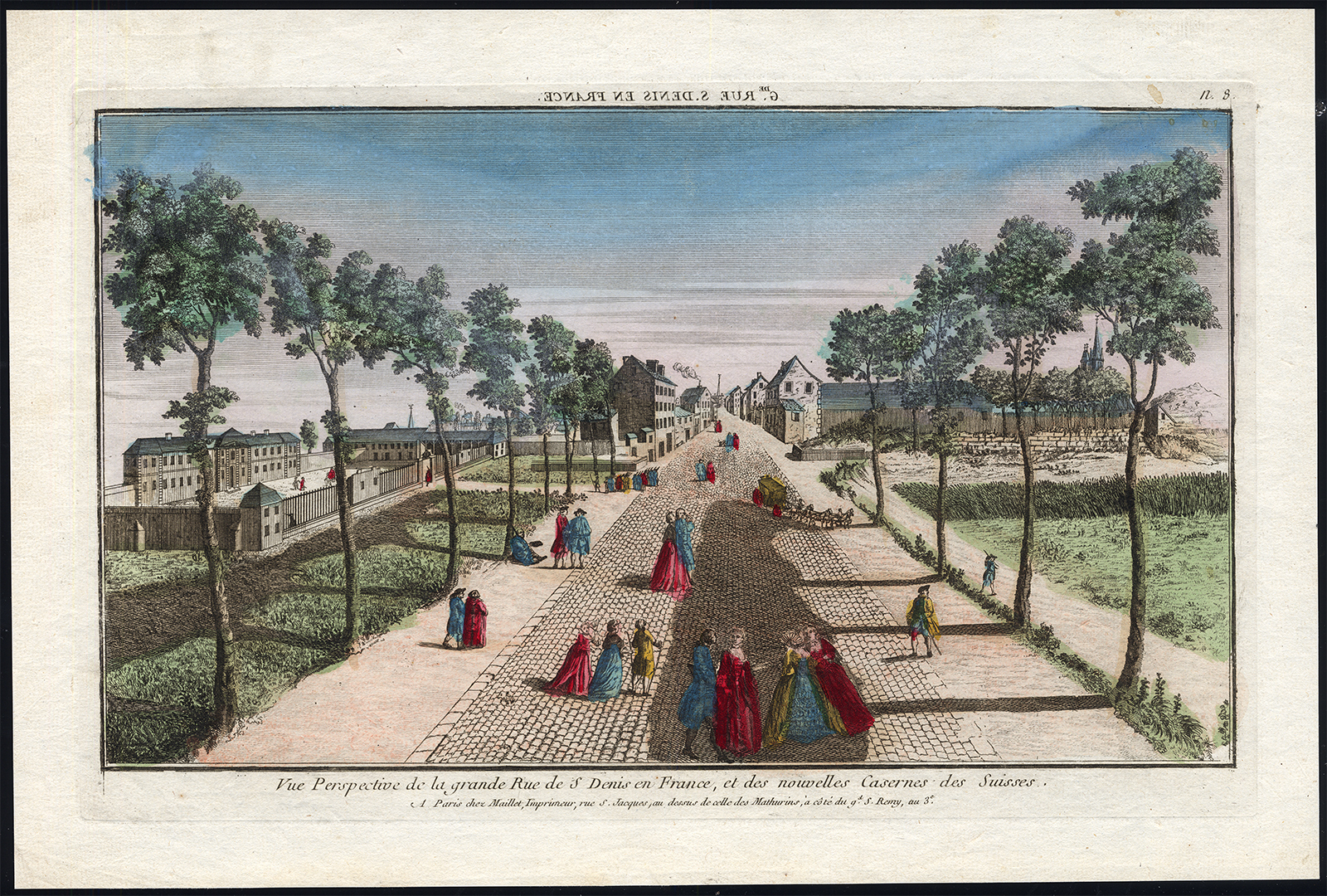 Antieke optische print-ZWITSERSE WACHT-KAZERS-PARIJS-RUE S DENIS-FRANCE-Maillet-1770