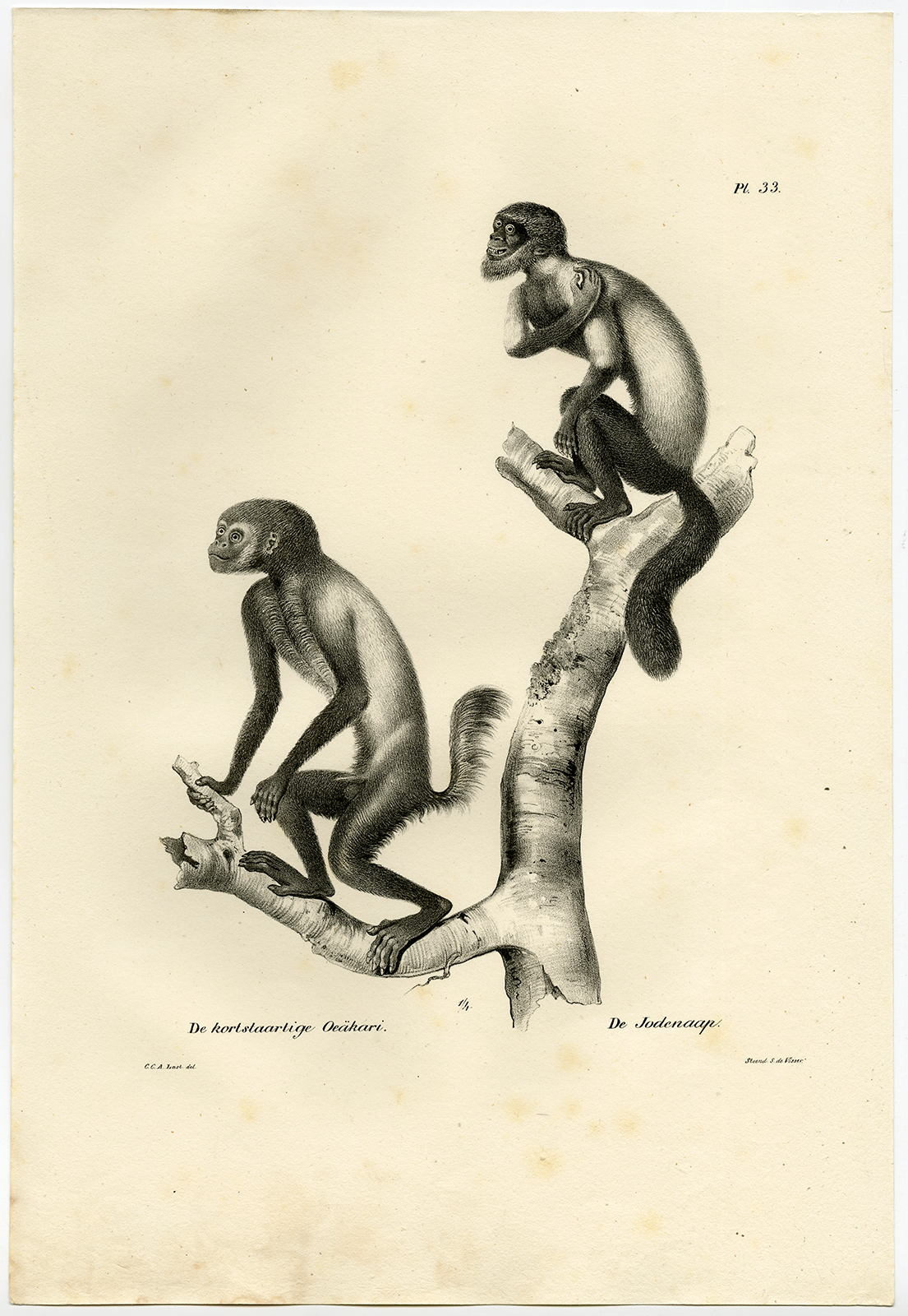 Onderwerp: Antieke prent, getiteld: ‘Plaat 33: ‘De Kortstaartige Oeakari – De Jodenaap’.’ – Dit bord toont apensoorten; uakari enz..