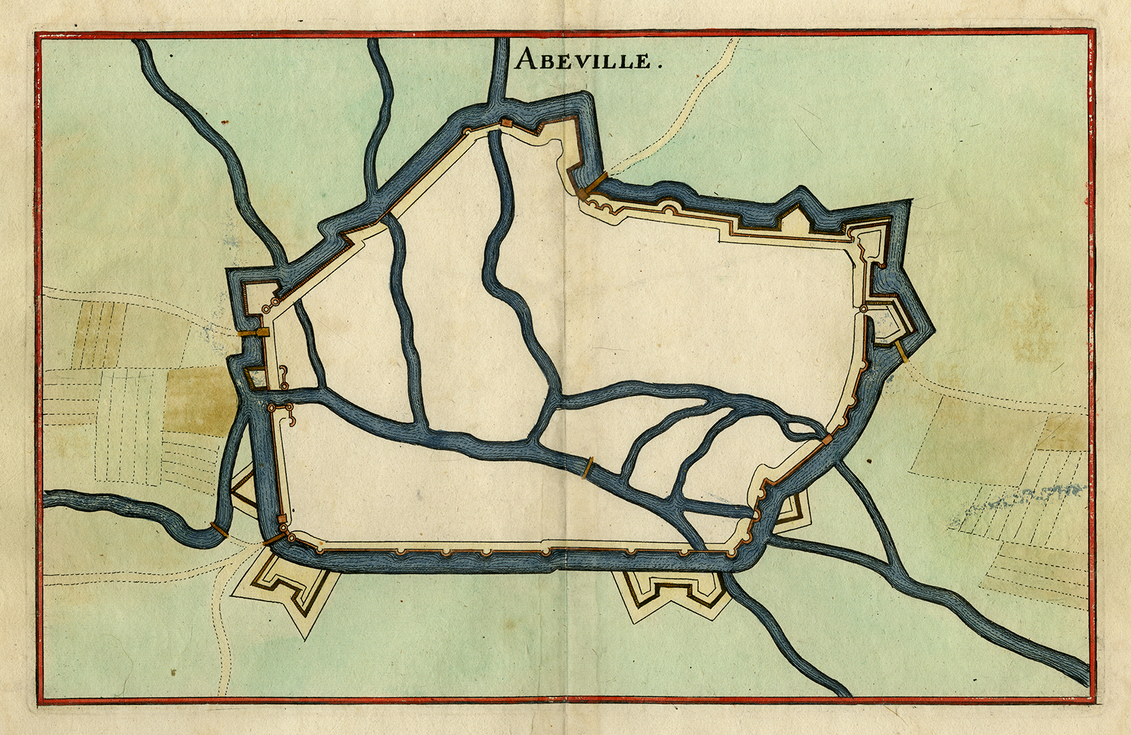 Onderwerp: Plaat: ‘Abeville’. Dit bord toont de vestingstad Abbeville in Frankrijk.