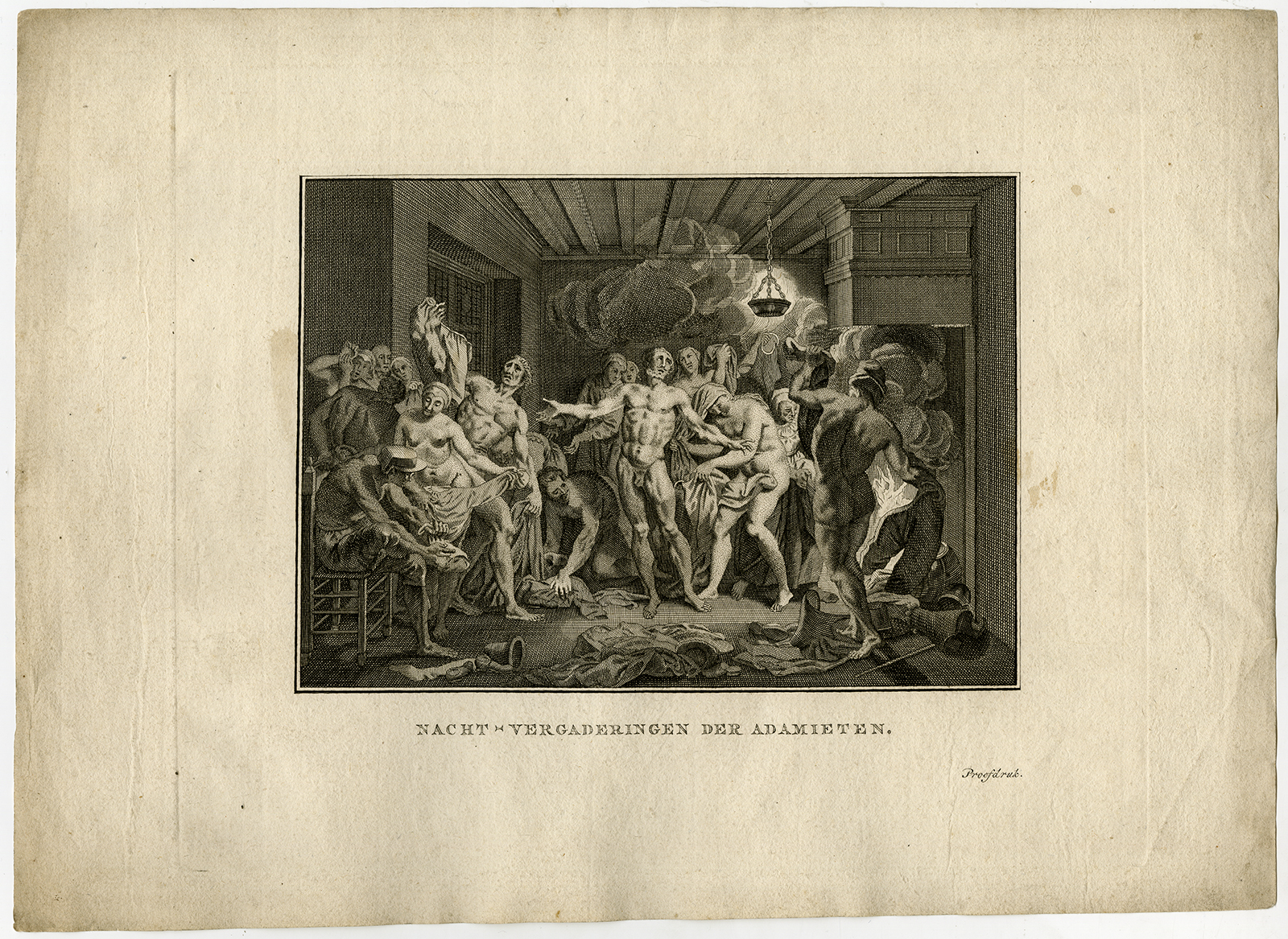 Onderwerp: Antieke prent, getiteld: ”Nacht-vergaderingen der Adamieten.” – Deze schaarse originele antieke prent toont naakte Adamieten, of Adamians, aanhangers van een vroegchristelijke sekte die zich in de 2e, 3e en 4e eeuw in Noord-Afrika verzamelde. Er waren later soortgelijke sekten in Europa. Ze droegen geen kleding tijdens hun religieuze diensten. Dit is een proefafdruk.
