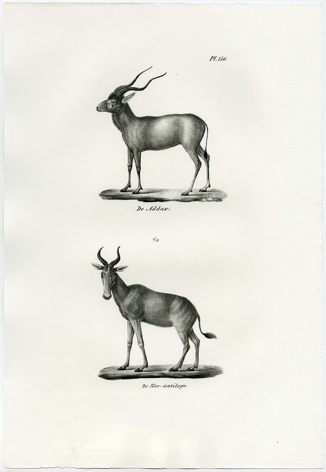 Onderwerp: Antieke prent, getiteld: ‘Pl. 150. De Addax – De Koe-antilope.’ – Op dit bord zijn de Addax en Bubal Hartebeest afgebeeld, ook wel Bubal Antilope genoemd (uitgestorven).