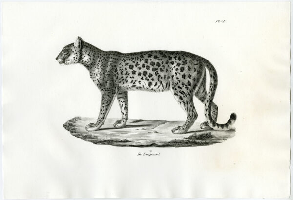 Onderwerp: Antieke prent, getiteld: ‘Pl. 82. De Luipaard.’ – Dit bord toont het Afrikaanse luipaard.