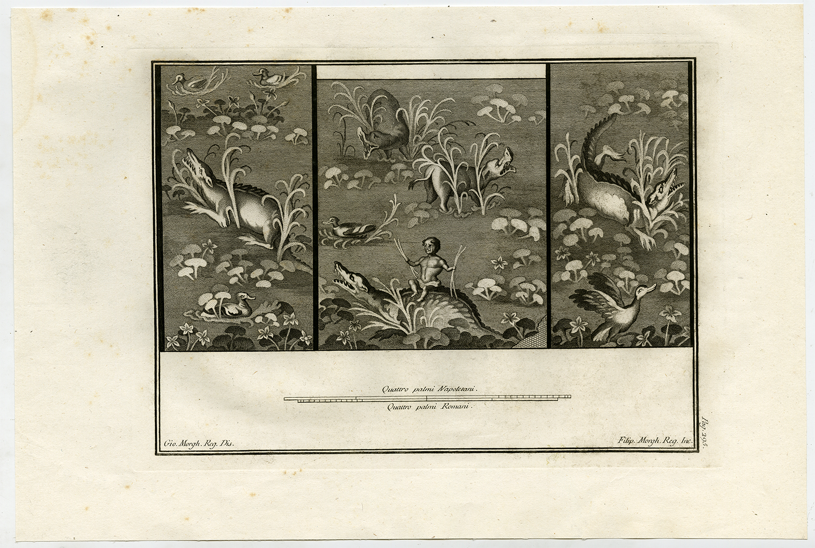 Antieke prent-ARCHEOLOGIE-ITALIË-HERCULANEUM-FRESCO-KROKODIL-Morghen-1757