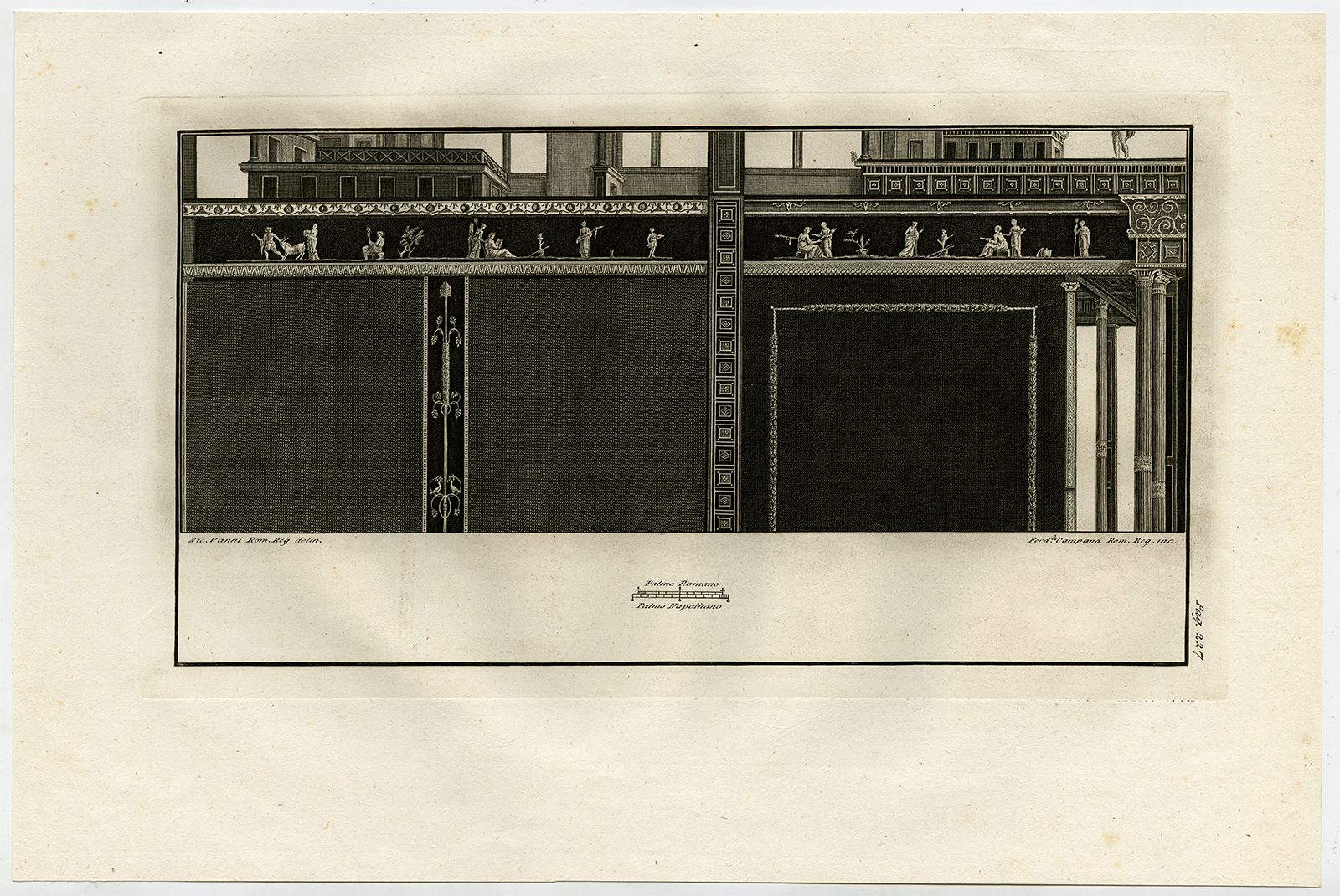 Onderwerp: Antieke prent, getiteld: ”Pag. 227.” – Deze schaarse originele antieke print toont oude kunst uit de ruïnes van Herculaneum in Italië. Deze prenten hebben we gemaakt naar fresco’s en artefacten die zijn opgegraven in Herculaneum (begraven tijdens de uitbarsting van de Vesuvius in 79 n.Chr.).
