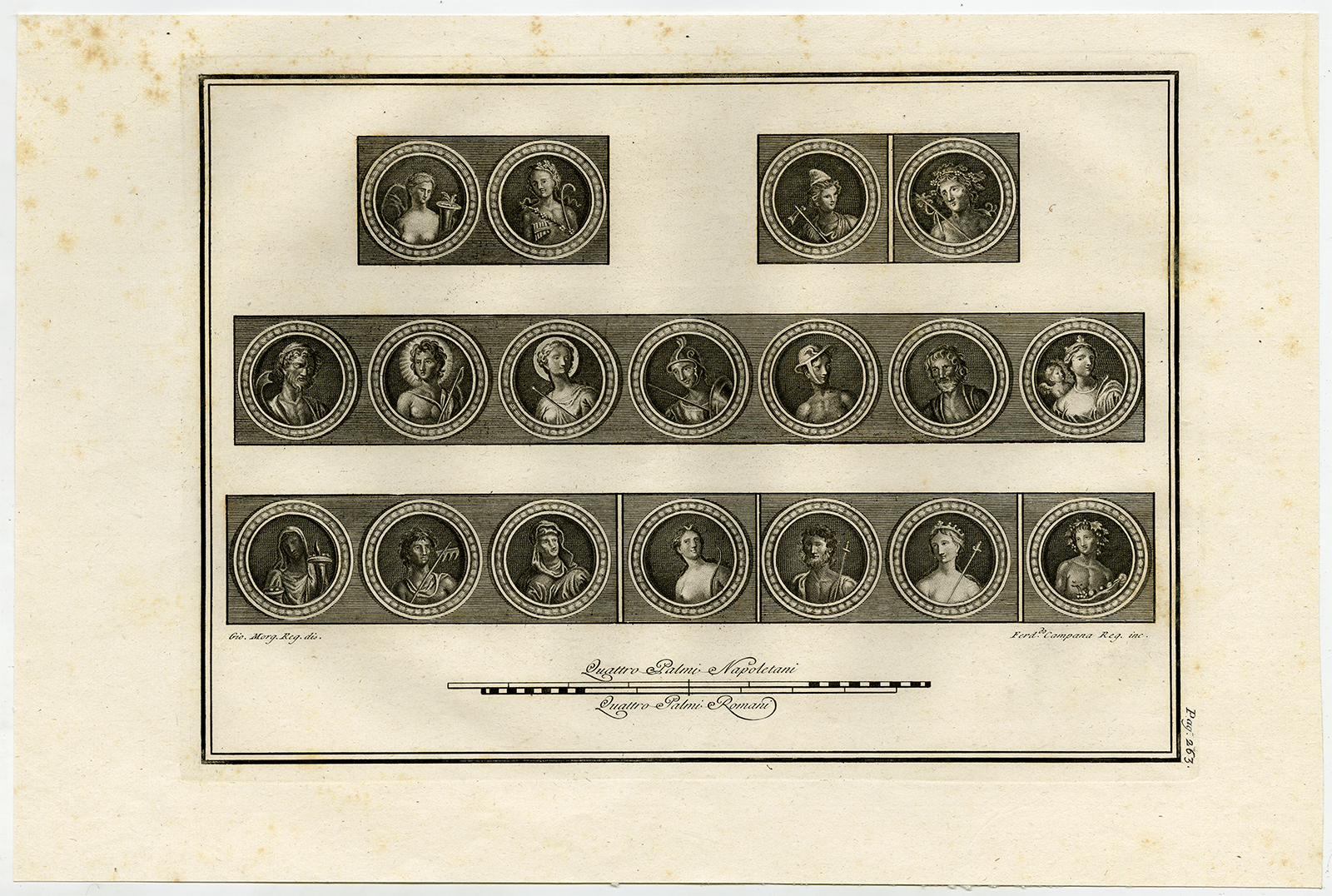 Onderwerp: Antieke prent, getiteld: ”Pag. 263.” – Deze schaarse originele antieke prent toont oude kunst uit de ruïnes van Herculaneum in Italië; portretten. Deze prenten hebben we gemaakt naar fresco’s en artefacten die zijn opgegraven in Herculaneum (begraven tijdens de uitbarsting van de Vesuvius in 79 n.Chr.).