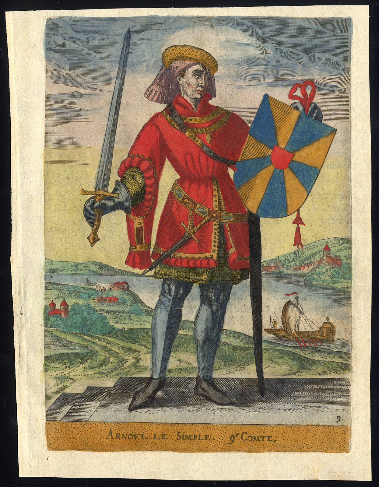 Onderwerp: Plaat 9: ‘Arnoul le Simple, 9e Comte.’ Deze plaat toont een portret van Arnulf III (gestorven in 1071), ook bekend als Arnulf ‘de ongelukkige’. Hij werd als minderjarige graaf van Vlaanderen in 1070 en tot aan zijn dood in 1071. Met wapen. Tekst in het Frans op de achterzijde.