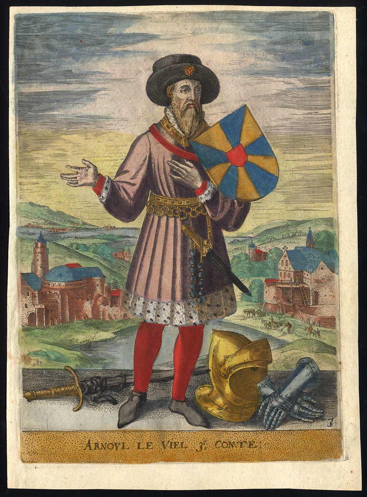 Onderwerp: Plaat 3: ‘Arnoul le Viel, 3e Comte.’ Deze plaat toont een portret van Arnulf van Vlaanderen (ca. 890 ´?¢ 965), genaamd de Grote. Hij was de derde graaf van Vlaanderen, die regeerde over het graafschap Vlaanderen, een gebied dat nu Noordwest-België en Zuidwest-Nederland omvat. Met wapenschild en harnas. Tekst in het Frans op de achterzijde.